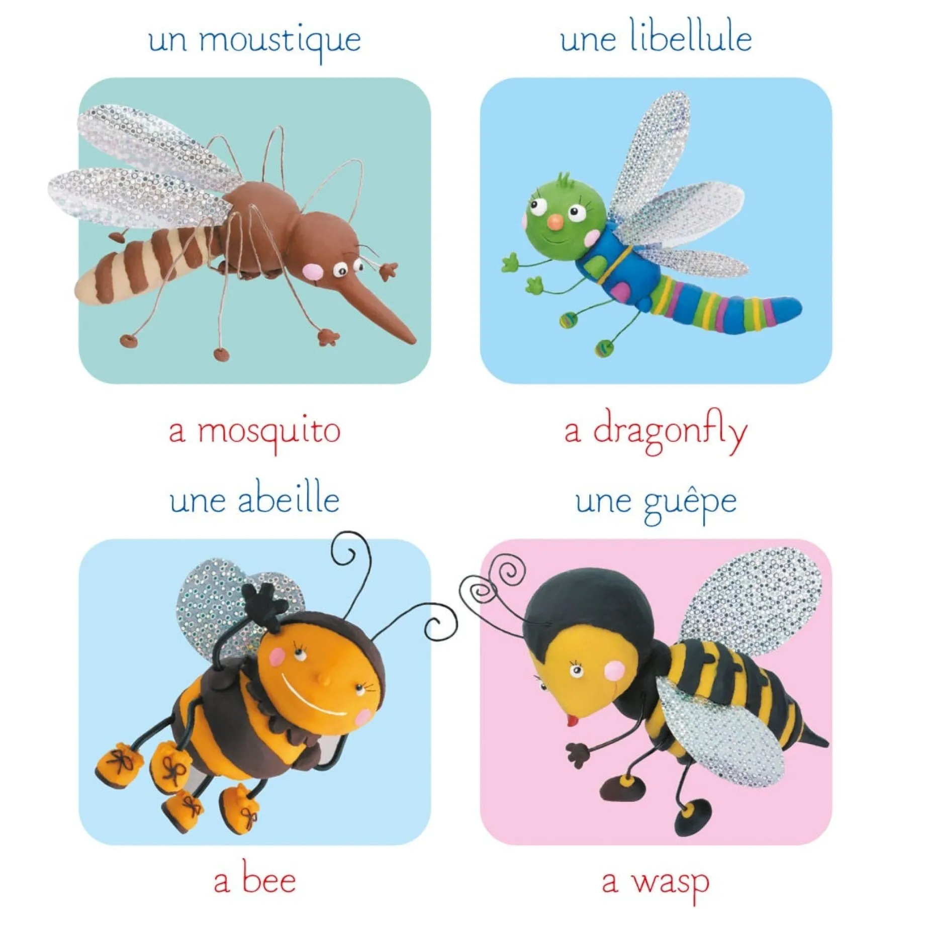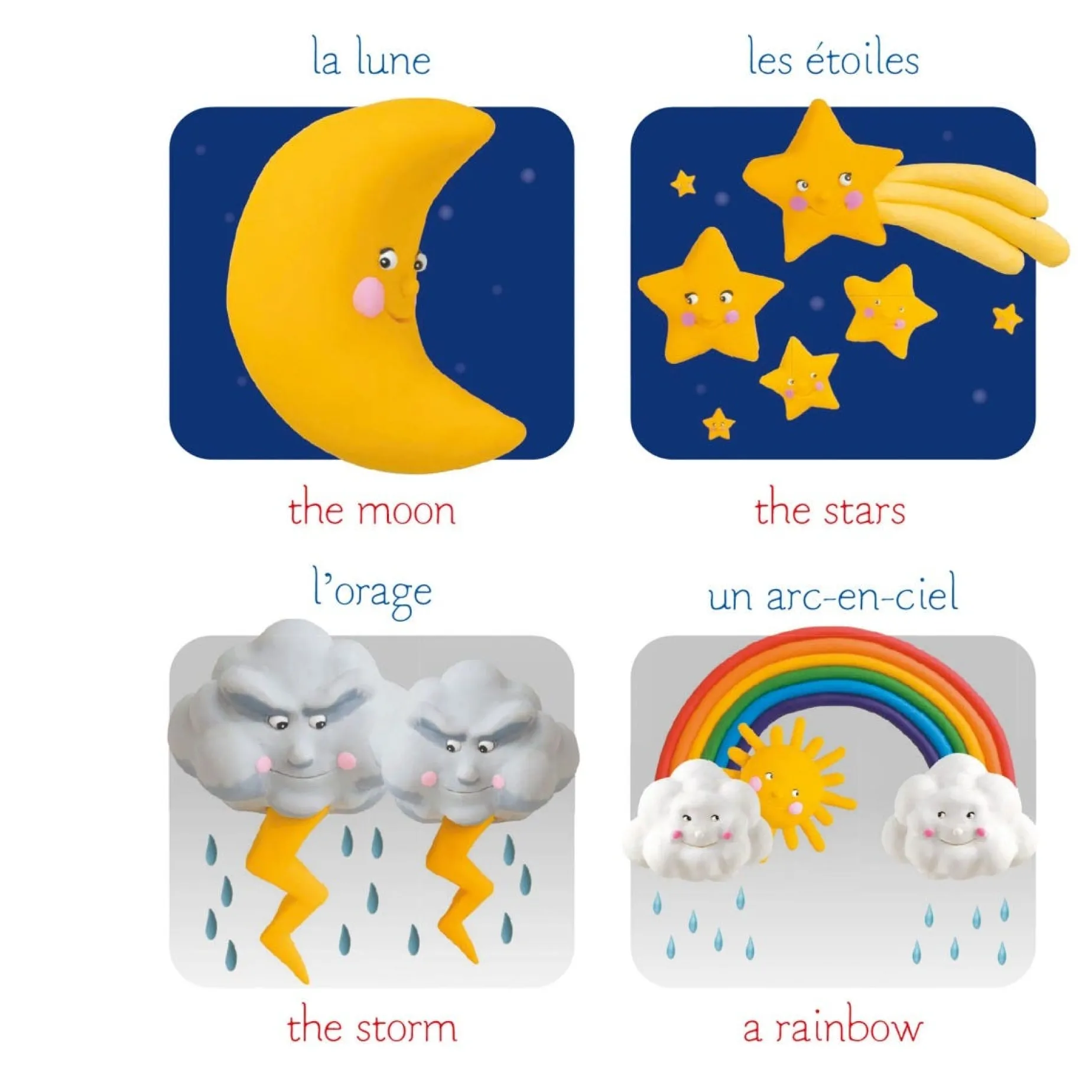 Adorable imagery illustrated in modeling clay to introduce little ones to the first words of English.