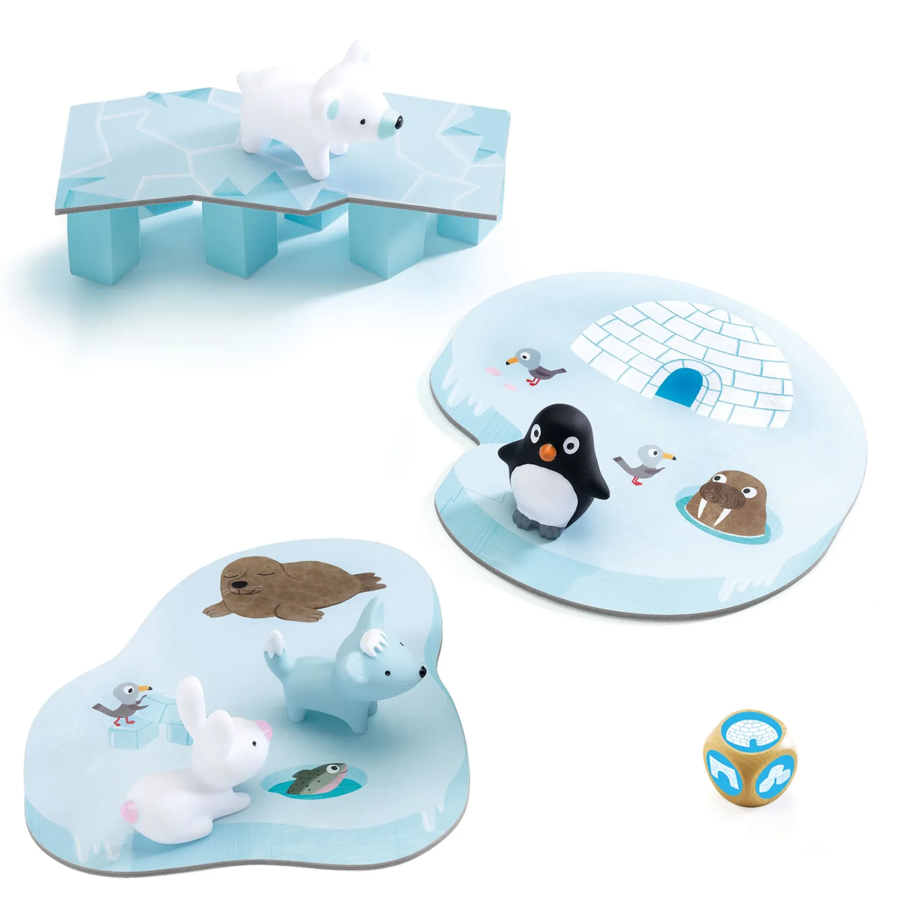A cooperation game specially designed for little ones aged 2 ½ and over. Up on the ice floe, the 4 little animals are trying to get back to their igloo. To win the game, players must follow the instructions on the dice to help them over the ice bridge before it collapses. If all the animals get home safely, you win the game!