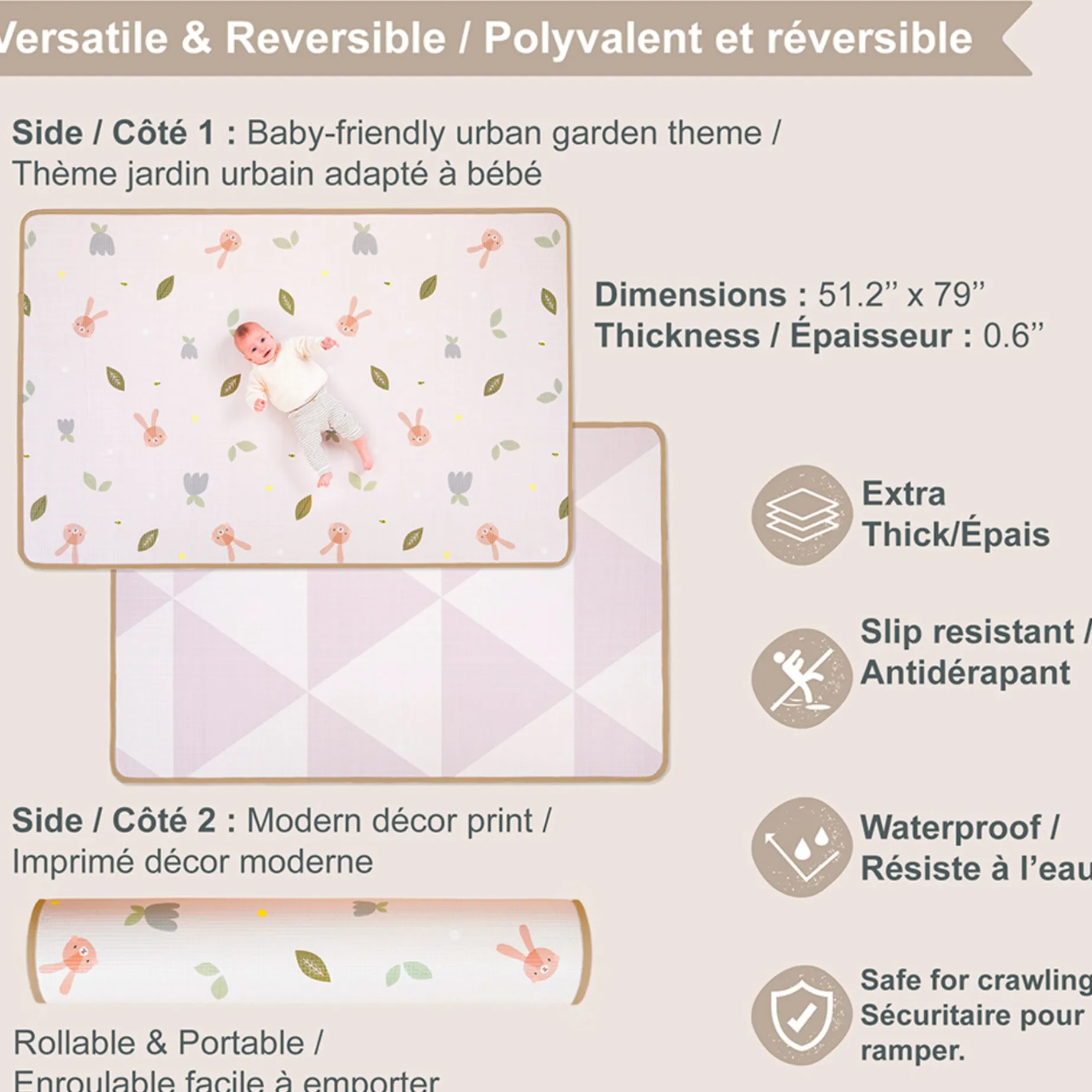 •Versatile reversible design: With 2 designs – from a baby-friendly urban garden theme to a modern decorative print for two looks in one, this play mat offers both versatility and style.