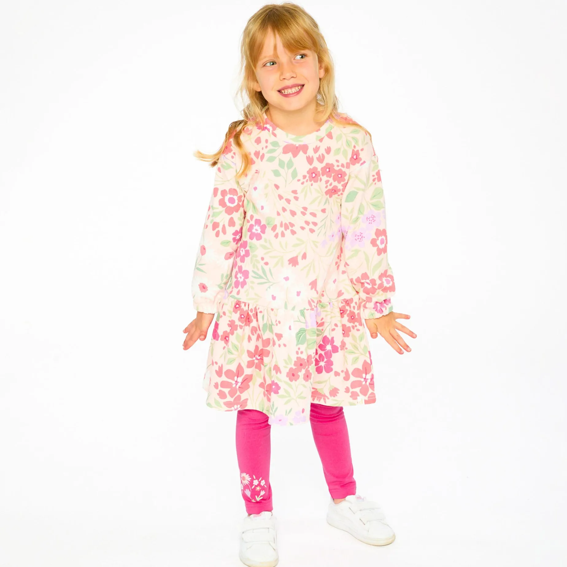 Our French terry dress pink with printed flowers is a cozy yet playful piece for cooler days. This dress features a relaxed fit, long sleeves with elastic cuffs, a round neckline, and a gathered skirt for extra movement. Made from soft stretch French terry with an allover floral print, it’s a cheerful choice for her, perfect to pair with items from our “Little Meadow” collection.