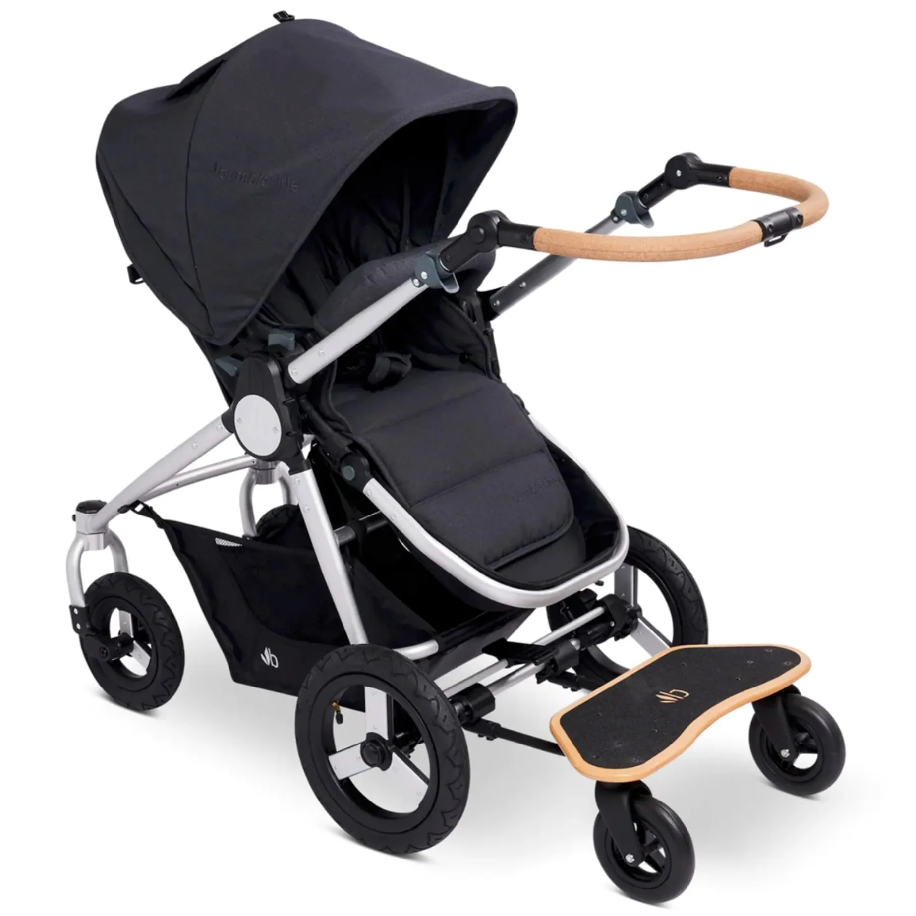 A skateboard-style toddler board with a slip resistant deck. The Mini Board easily attaches to the back of the stroller and offers a fun, “I’m a big kid” ride along experience. This new, improved version allows you to fold and stow the board when not in use with just a few snaps. The stroller is foldable with the board attached.
