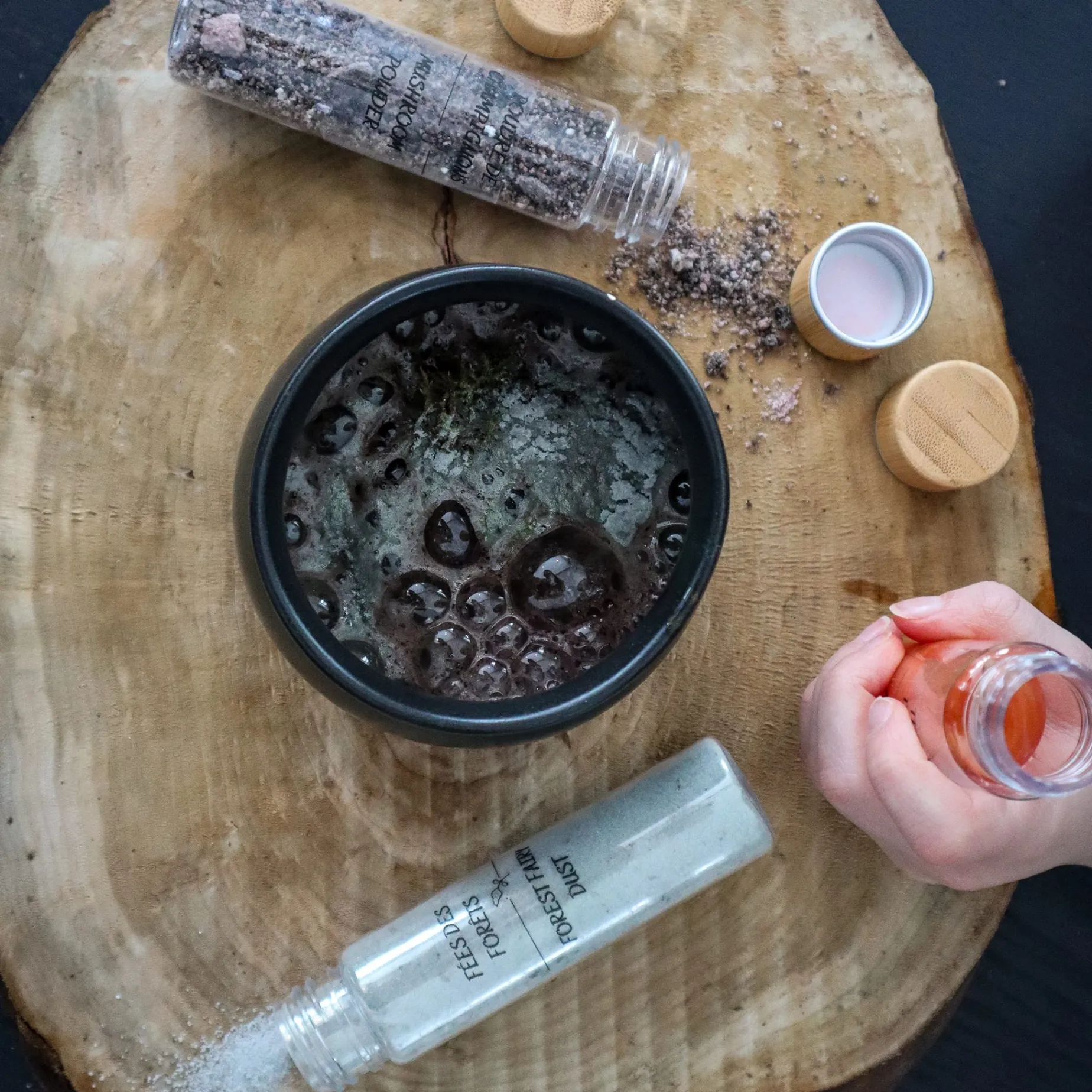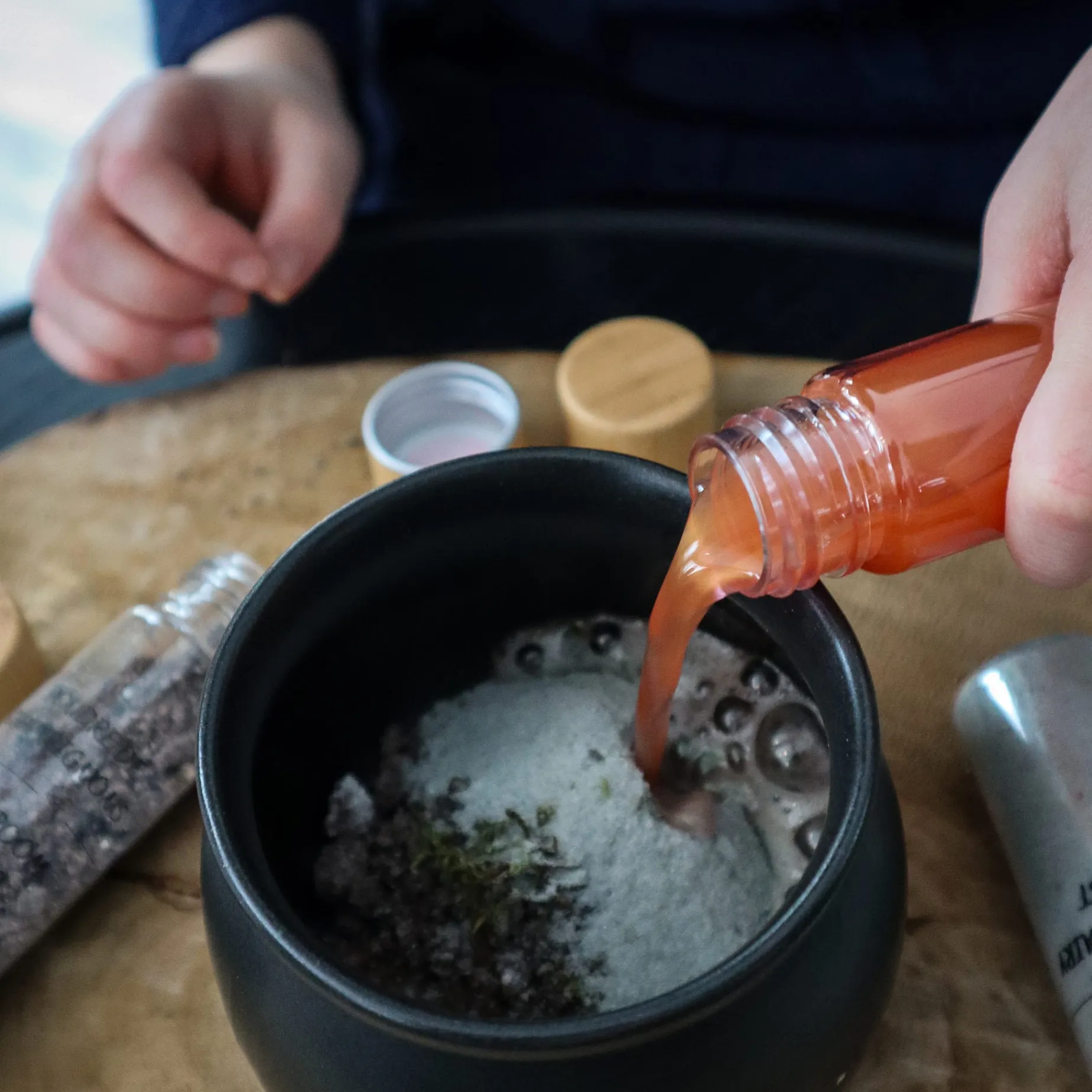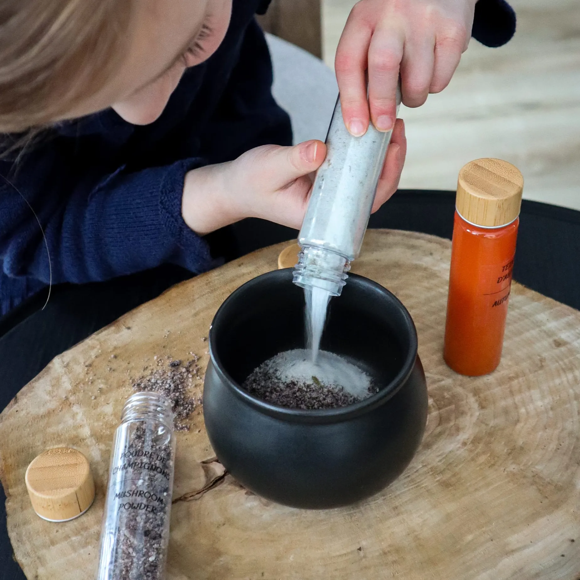 With soothing forest ingredients, this mini magic potion play kit will help your child feel safe and find the courage to face any adventure. Each ingredient in this set is unique and will allow your young wizard to create a talisman of protection. Activate the power of bubbles for a magical experience with this single-use pocket-sized kit!