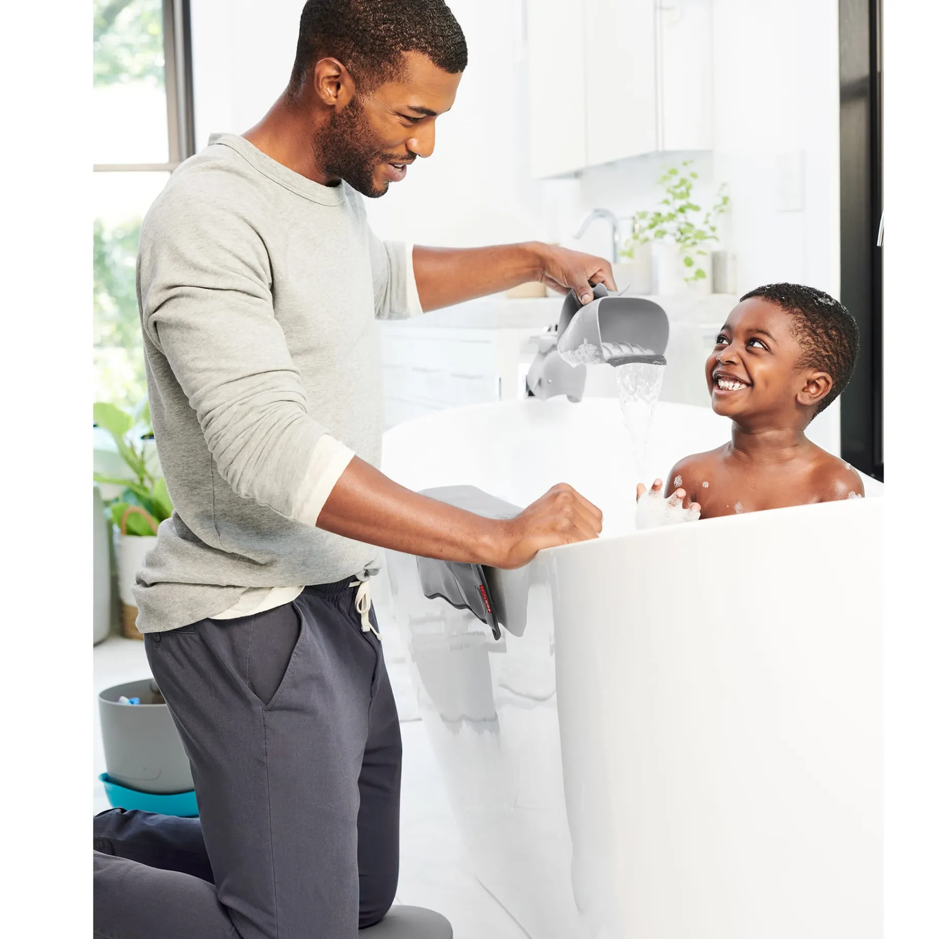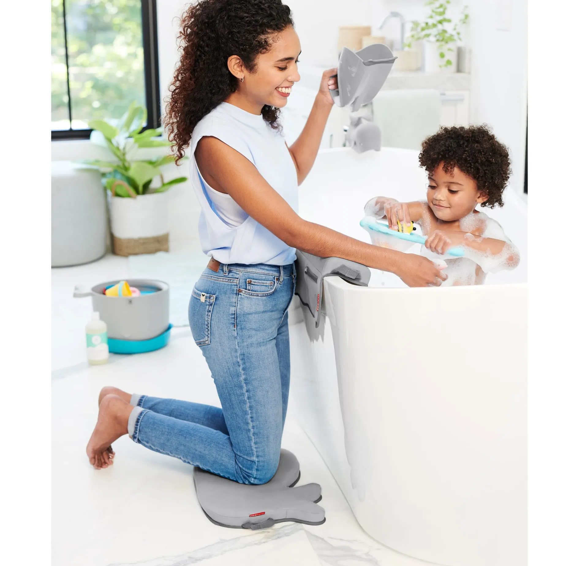Bathing baby is a breeze with the help of our handy bathtime helper kit. Packed with four of our popular Moby bath basics in decor-friendly grey, the four-piece set includes a rinser, soft spout cover, padded elbow rest and kneeler. Now parents can be just as comfy as little ones during tub time. Makes a welcome gift for first-time parents, too!