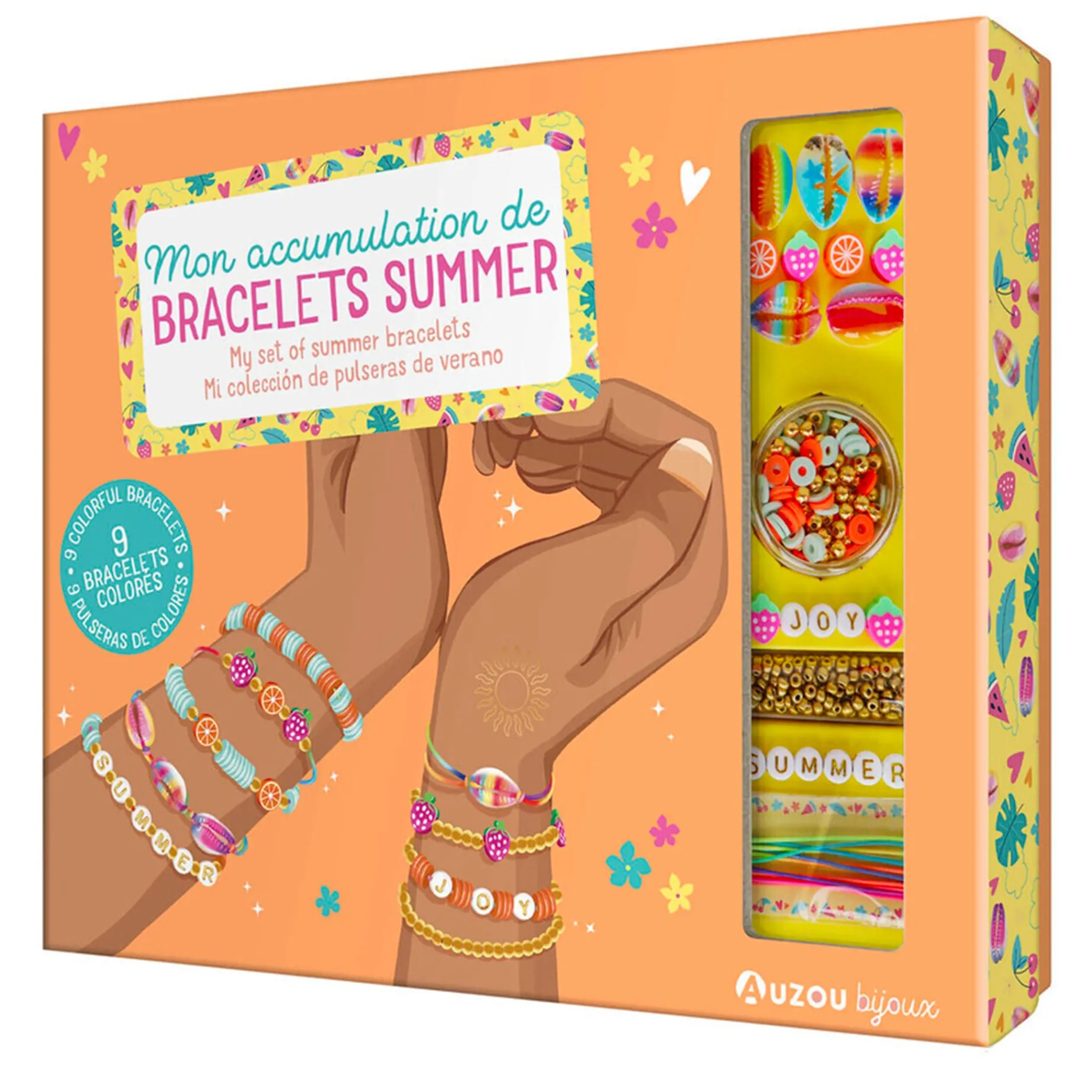 The materials and instructions needed to make nine bracelets for summer.