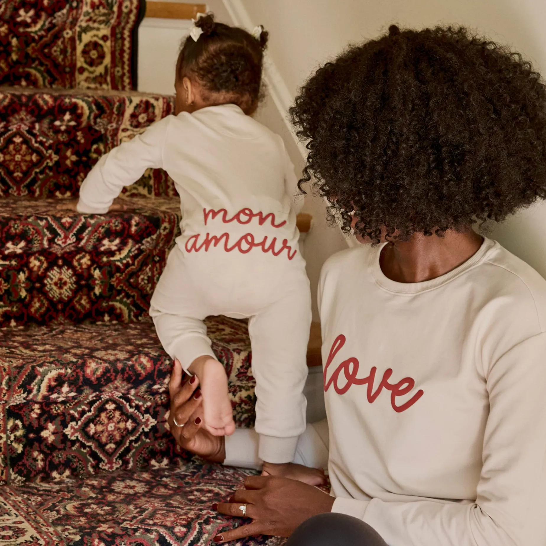 This adorable playsuit is perfect for the littlest member of the family and coordinates with sweaters from the same range for mom and older siblings. Made from the coziest French Terry, the one-piece will keep them snug and warm while the ribbed cuffs and ankles leave their hands and feet free to explore their surroundings. The full-length zip down the front makes dressing quick, easy and comfy. Finished with a chenille heart on the front and ‘Mon amour’ on the back, this piece is perfect for passing down through lovely little generations.