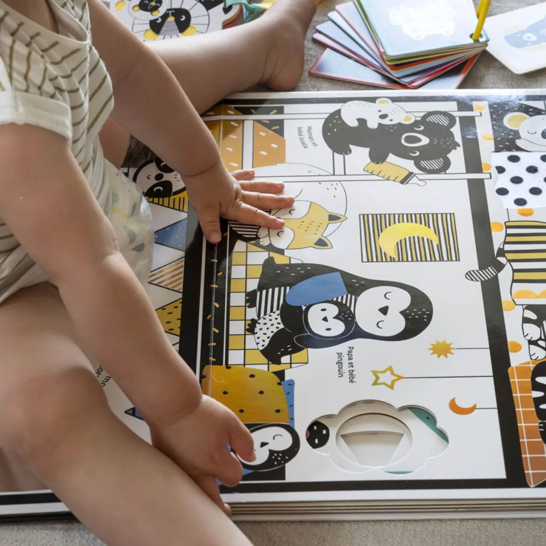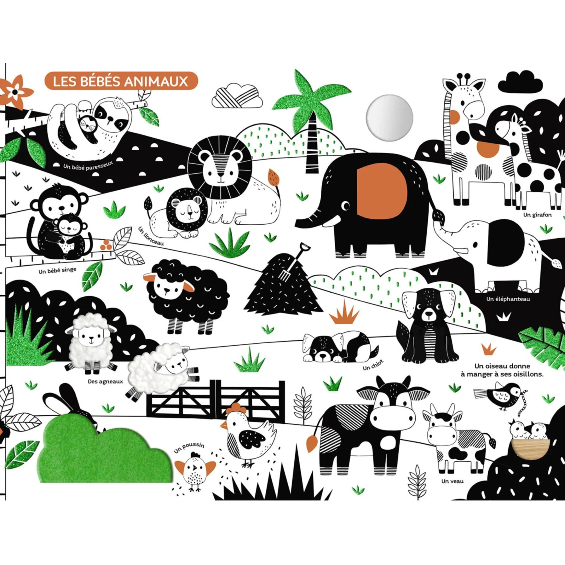4 grandes planches qui mettent en scène des univers constratés adorés des tout-petits : – La maison et les premiers mots du quotidien- Les bébés animaux- Les animaux géants- Au dodo les animaux !On retrouve plus de 20 matières à toucher et un miroir !
