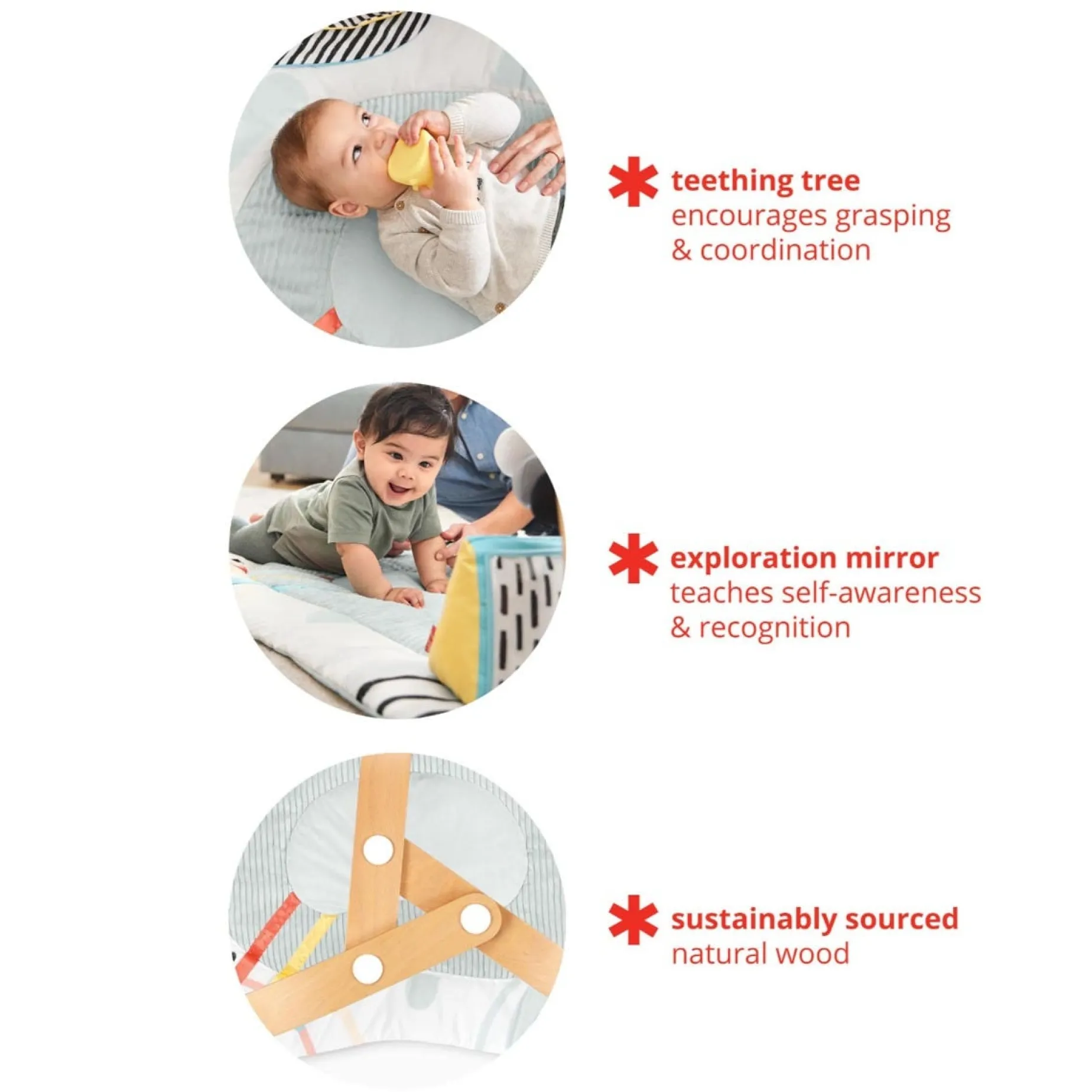 Designed in collaboration with experts in Montessori education, our Discoverosity Play Gym offers a balance of calming simplicity and an engaging sensory environment to nurture baby’s natural curiosity and development—from vision and concentration to fine motor skills and more. Crafted with sustainably-sourced wooden arches and a plush sensory playmat, the five nature-inspired developmental toys include contrasting patterns, crinkle sounds, a baby mirror and more to encourage self-directed activity and exploration. Six parent cards guide you through the gym’s milestone-driven play so you and baby can discover, learn and grow together.
