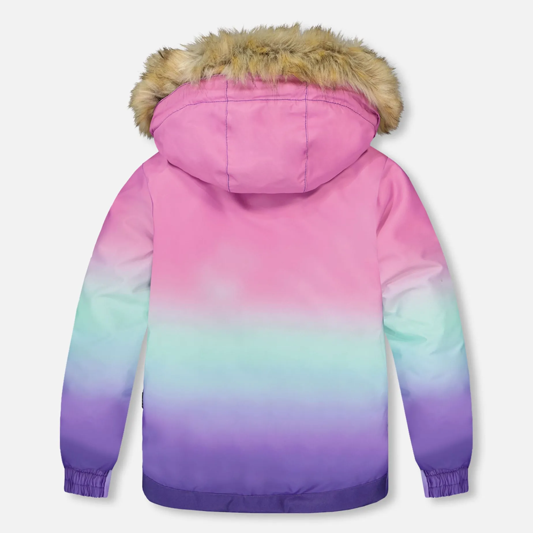 -Detachable and adjustable hood at the back of the head with removable synthetic fur and snow guard (OR if no fur: adjustable and detachable hood at the back and sides)