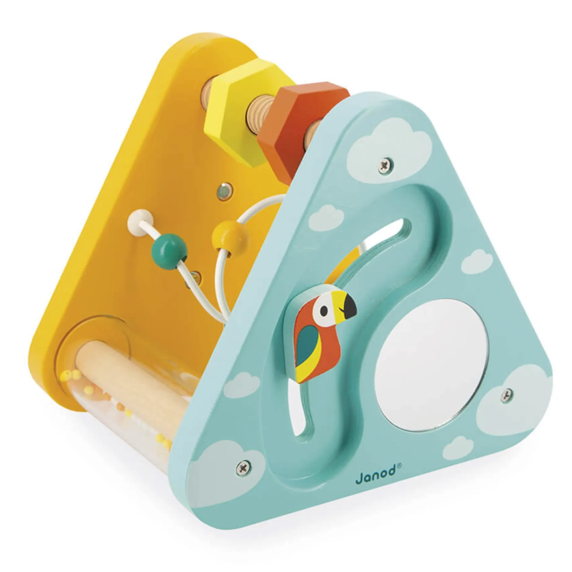 Multi-activity and vibrant triangle! This early learning toy promises many new discoveries for baby. With 7 activities: Maze, mirror, gears to turn, nuts to screw, abacus, rain stick and cylinders to align, this wooden toy is ideal for children from 12 months. Compact, this comprehensive toy is easy to carry around and for the child to handle. Children from the age of 1 will be able to develop their fine motor skills, their coordination and become familiar with colours and shapes! With a multitude of activities on each side, baby will always be discovering new things! This wooden early years toy is made from water-based paint and wood from sustainably managed, FSC®-certified forests.