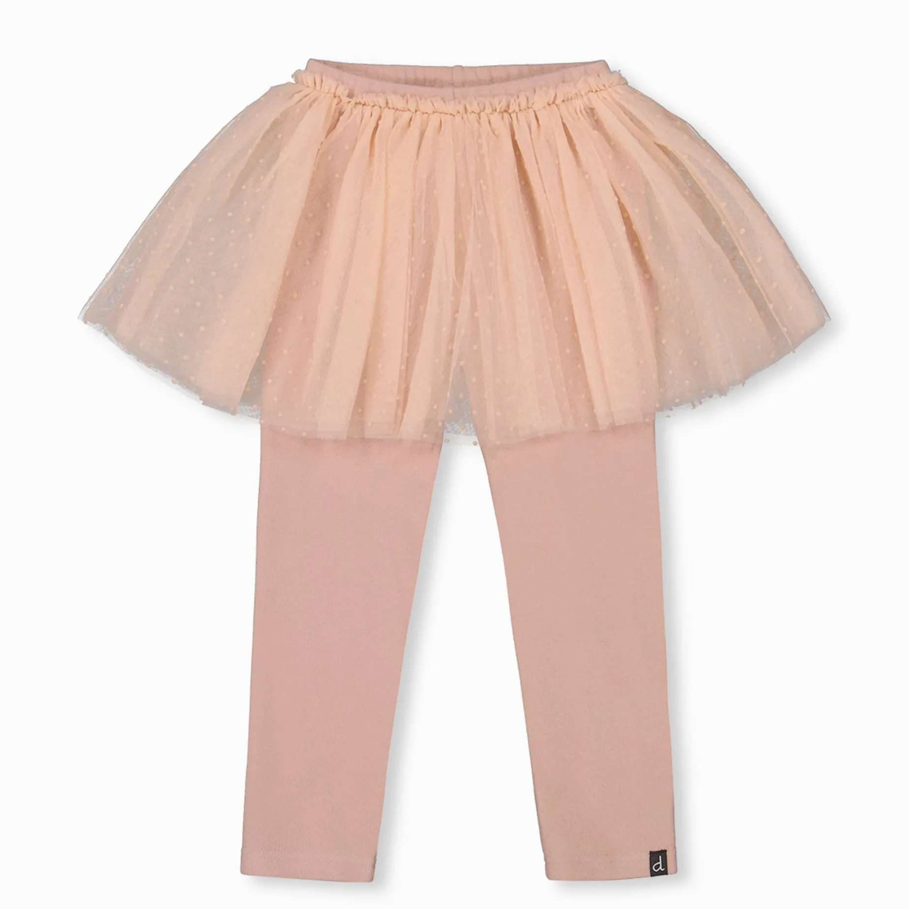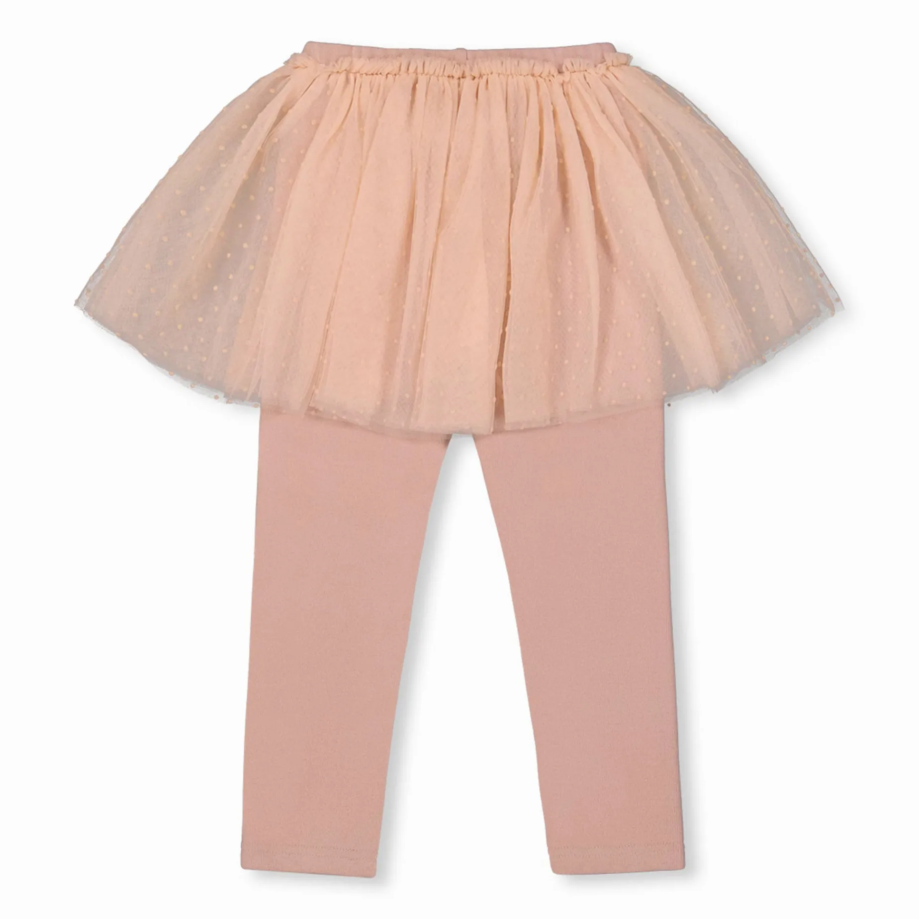 A tulle skirt overlay adds texture and whimsy to these oh-so-essential bottoms. A must-have for the girly girl who loves the comfortable feel of leggings, this adorable one-piece design features a stretch elastic waistband, a vertical ribbed texture, and a flared tulle skirt with an allover dot pattern.