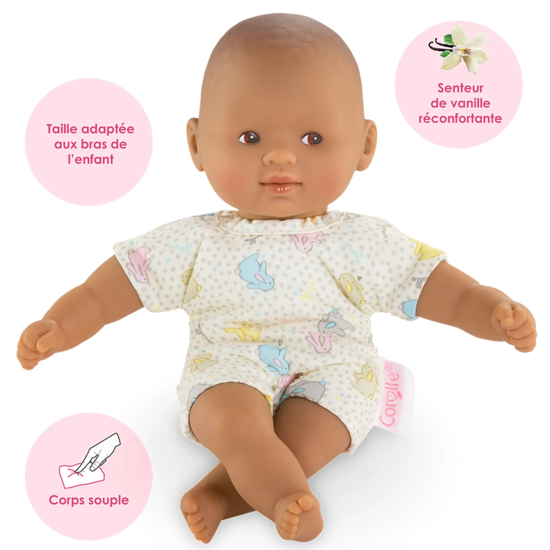 Mini Calin is a lightweight 8” (20 cm) mini doll that’s easy to take everywhere. She has matt skin and brown painted eyes. Her face, arms, and legs, with a delicate vanilla scent, are made of soft-touch vinyl. She wears a pretty bunny-print cloth body.