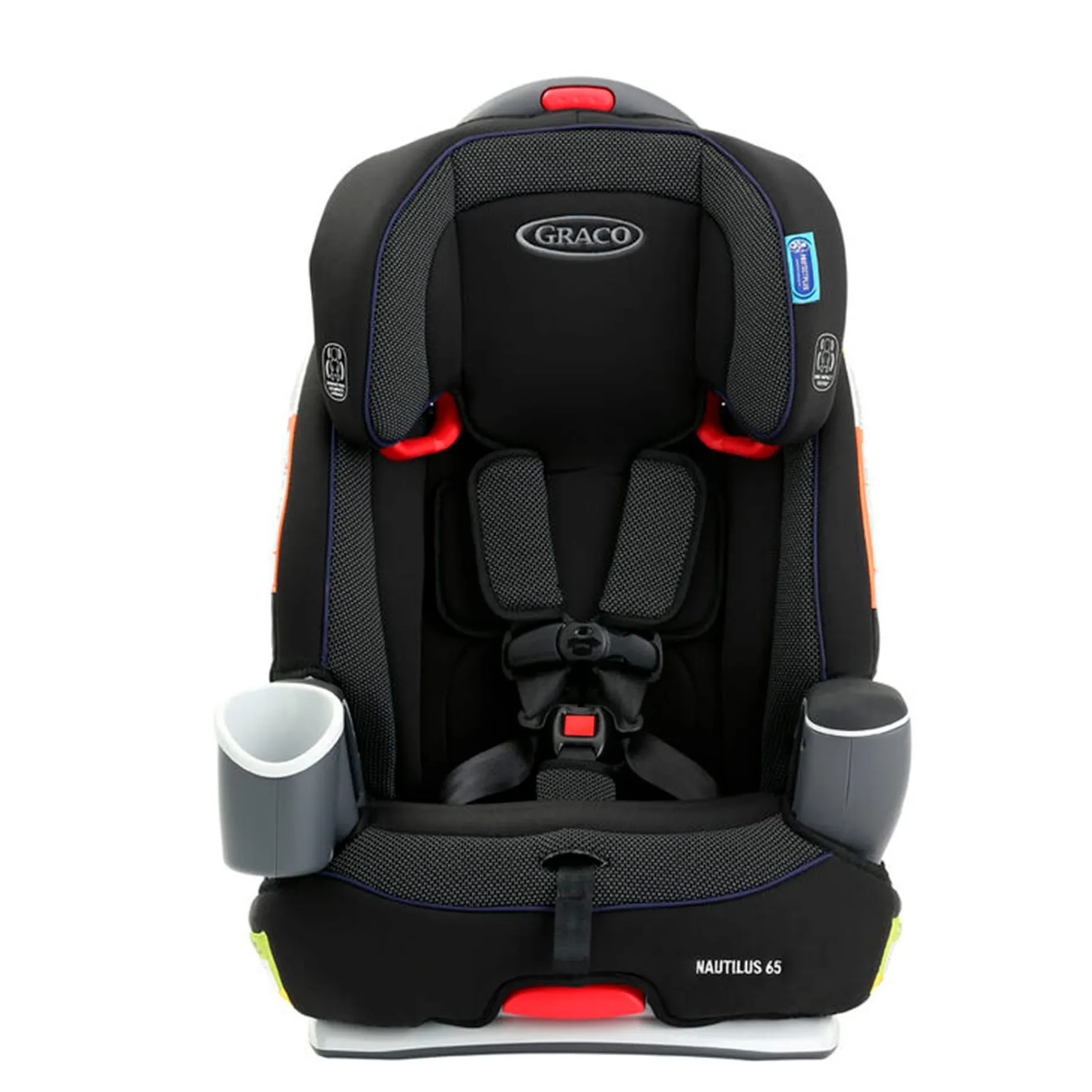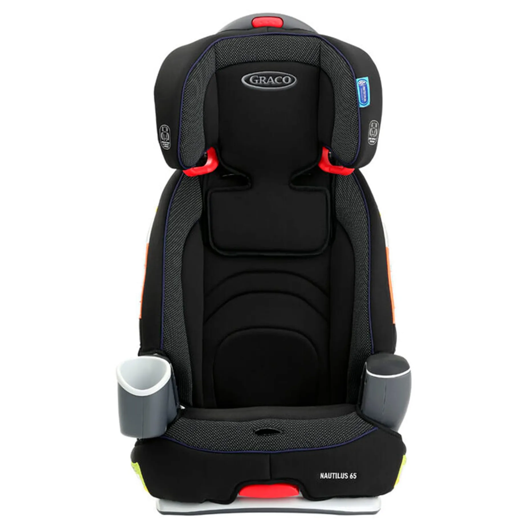 The Graco Nautilus 65 harness booster car seat goes the distance: in a 5-point harness 10-30 kg (22-65 lb), high back booster 18-45 kg (40-100 lb), and backless booster 18-45 kg (40-100 lb)