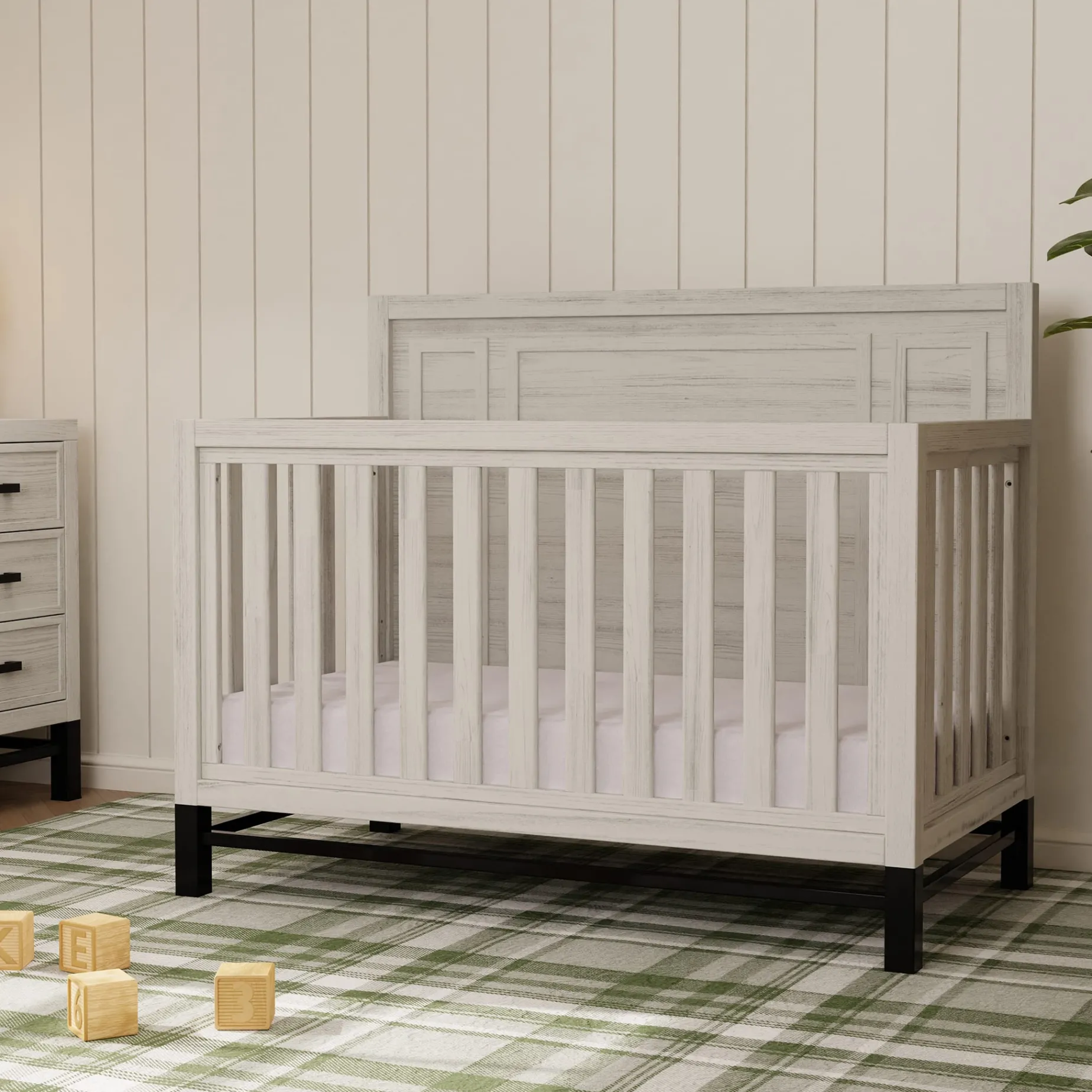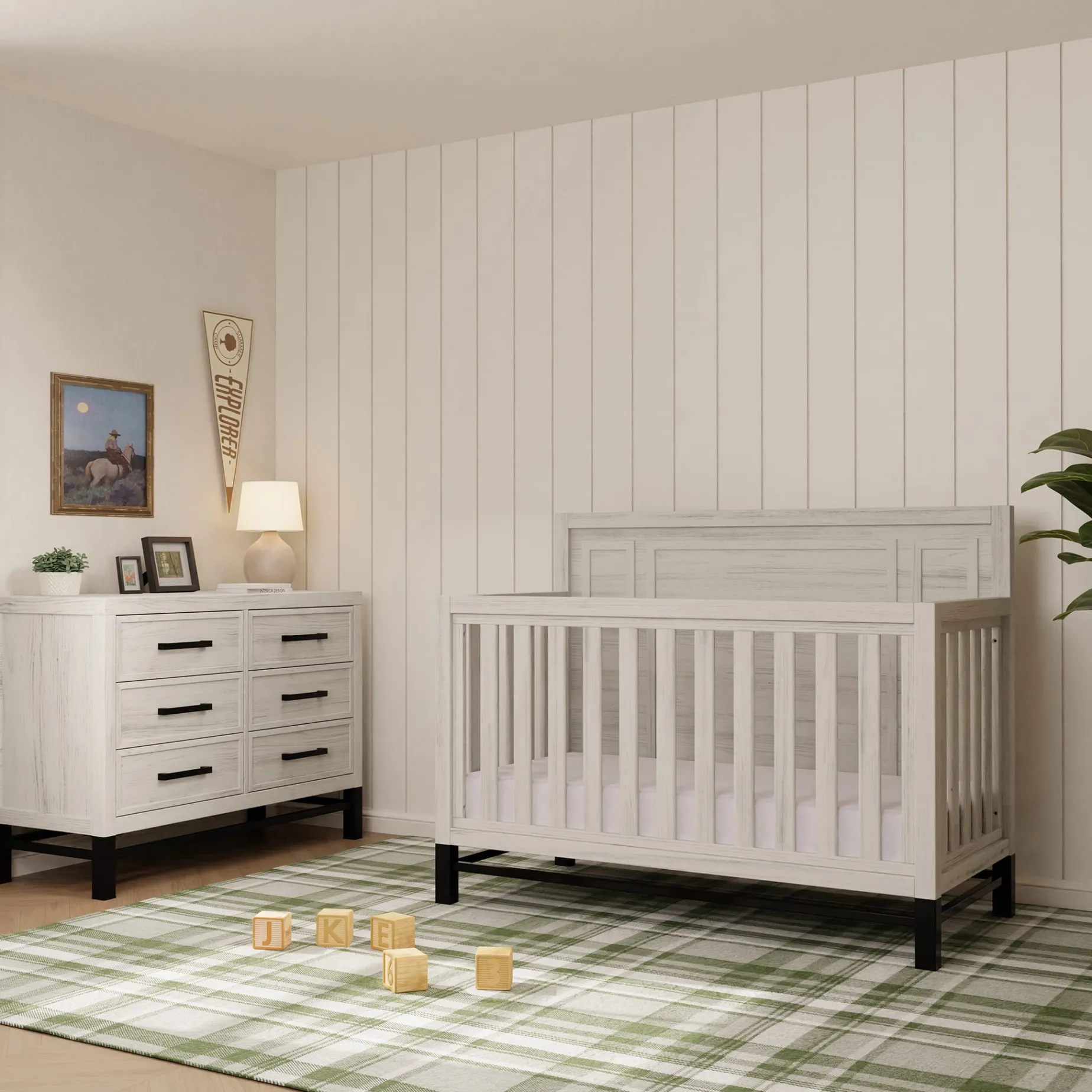 Lean into the modern farmhouse aesthetic with the Newbern 4-in-1 Convertible Crib. Featuring beautifully textured finish, streamlined metal base and contemporary trim details, this crib will perfectly complement your home. Built to seamlessly transition from newborn to toddler, the crib has four different mattress heights and easily converts to a toddler bed, daybed and full-size bed. Complete your nursery with the Newbern 6-Drawer Dresser. sold separately