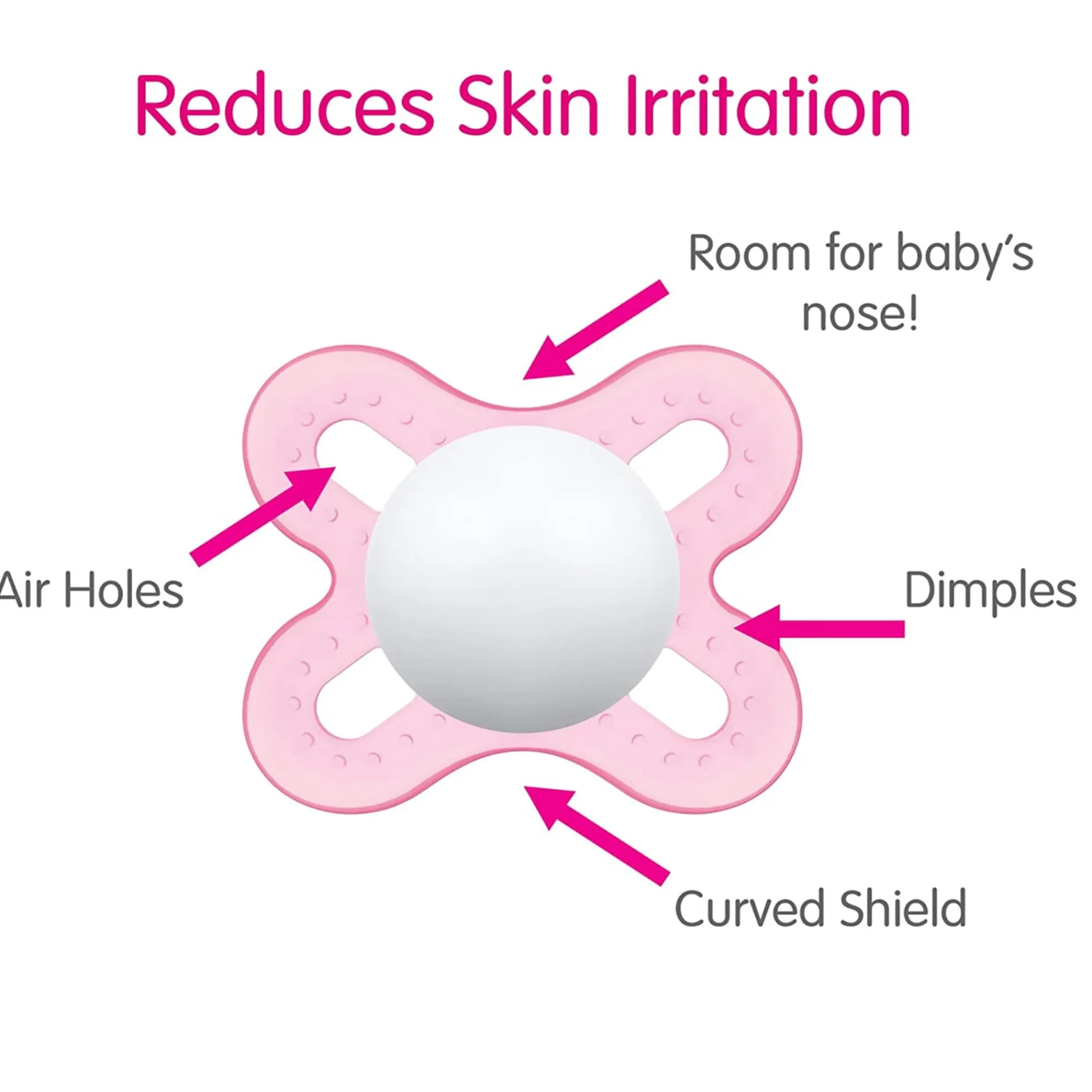 -Skin-friendly through big air holes and unique MAM dimples on the inside