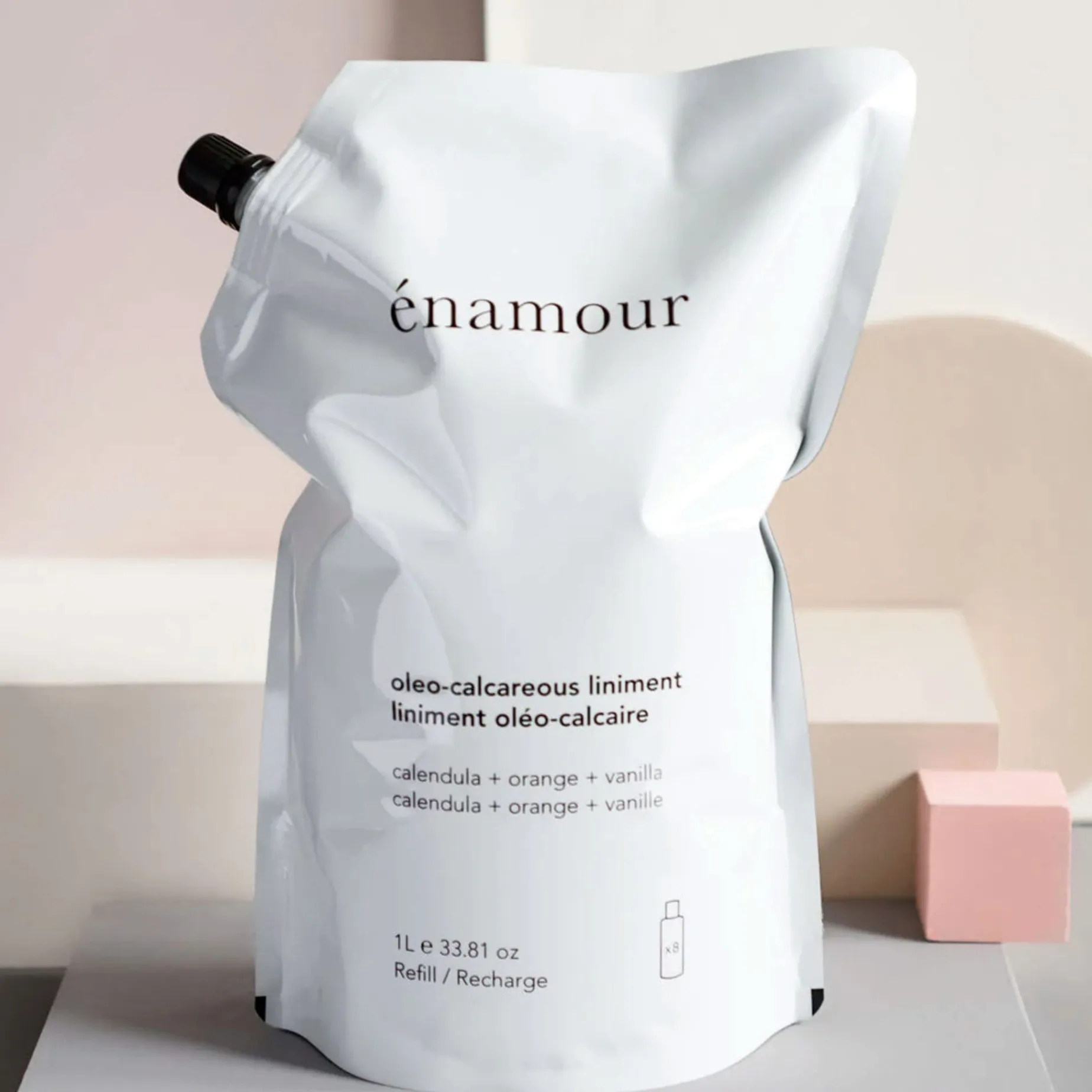 Enamour liniment is a deliciously fragrant substitute for generic baby lotions. Its key ingredient is alkaline lime water, which serves to neutralize the acidic pH of urine. The liniment leaves a light greasy film that protects baby’s skin from the harmful effects of urine. It also works wonders against cradle cap (also called “the hat”) on babies’ heads. A few applications are enough!