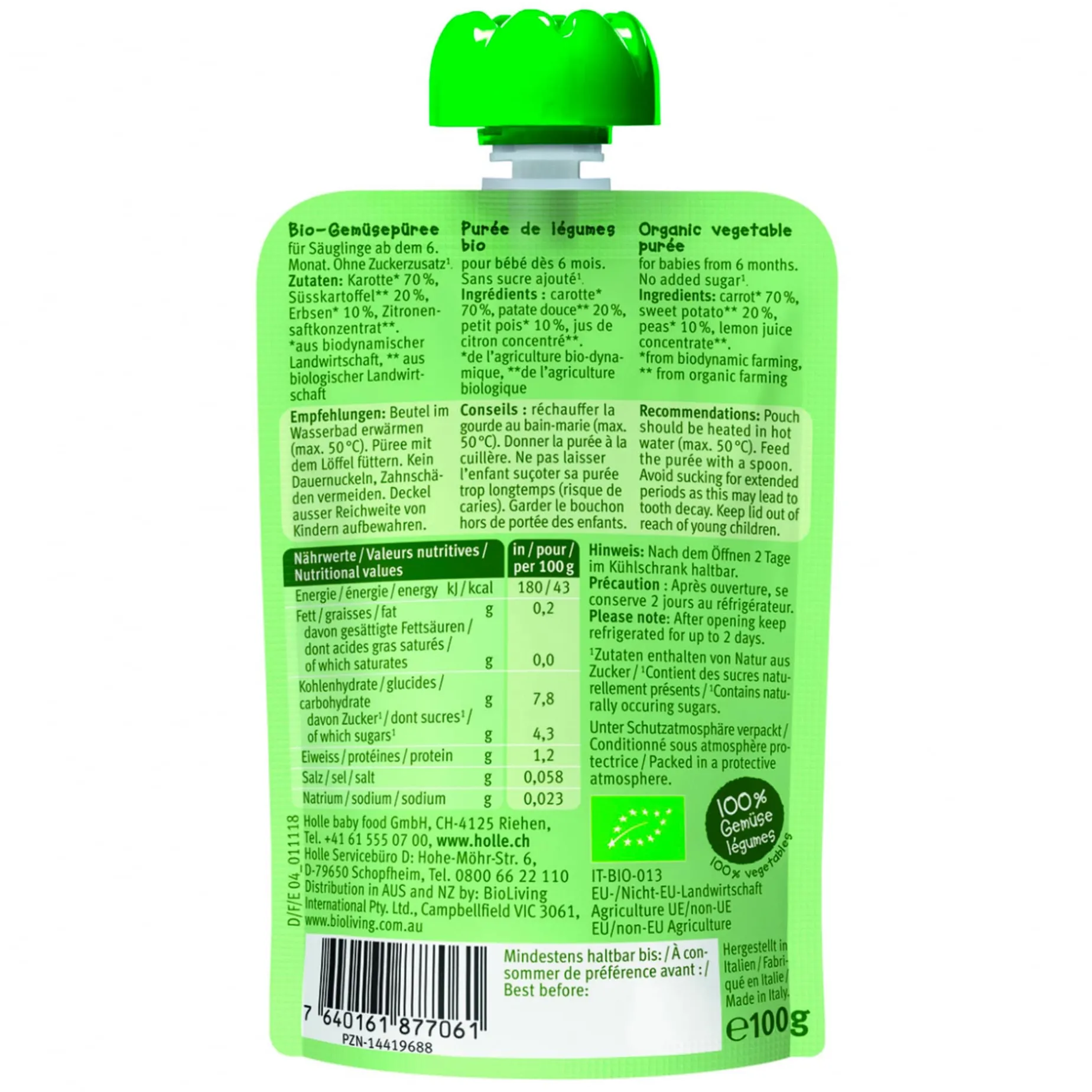 Ingredients: Carrot* 70%, sweet potato** 20%, peas* 10%, lemon juice concentrate**