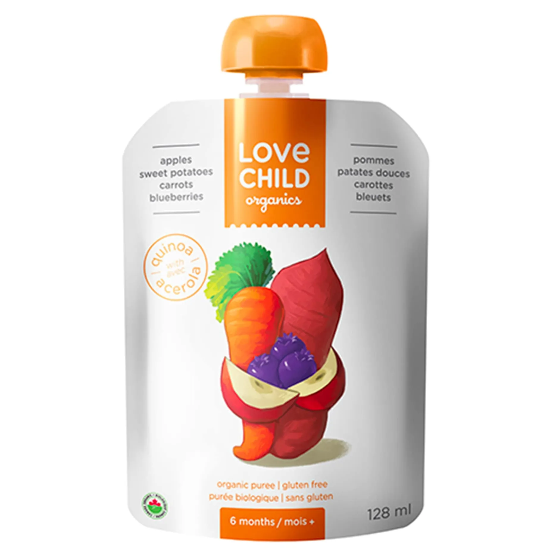 Ingredients: Organic apples, organic sweet potatoes, organic carrots, water, organic blueberries, organic acerola, organic quinoa, organic lemon juice concentrate.