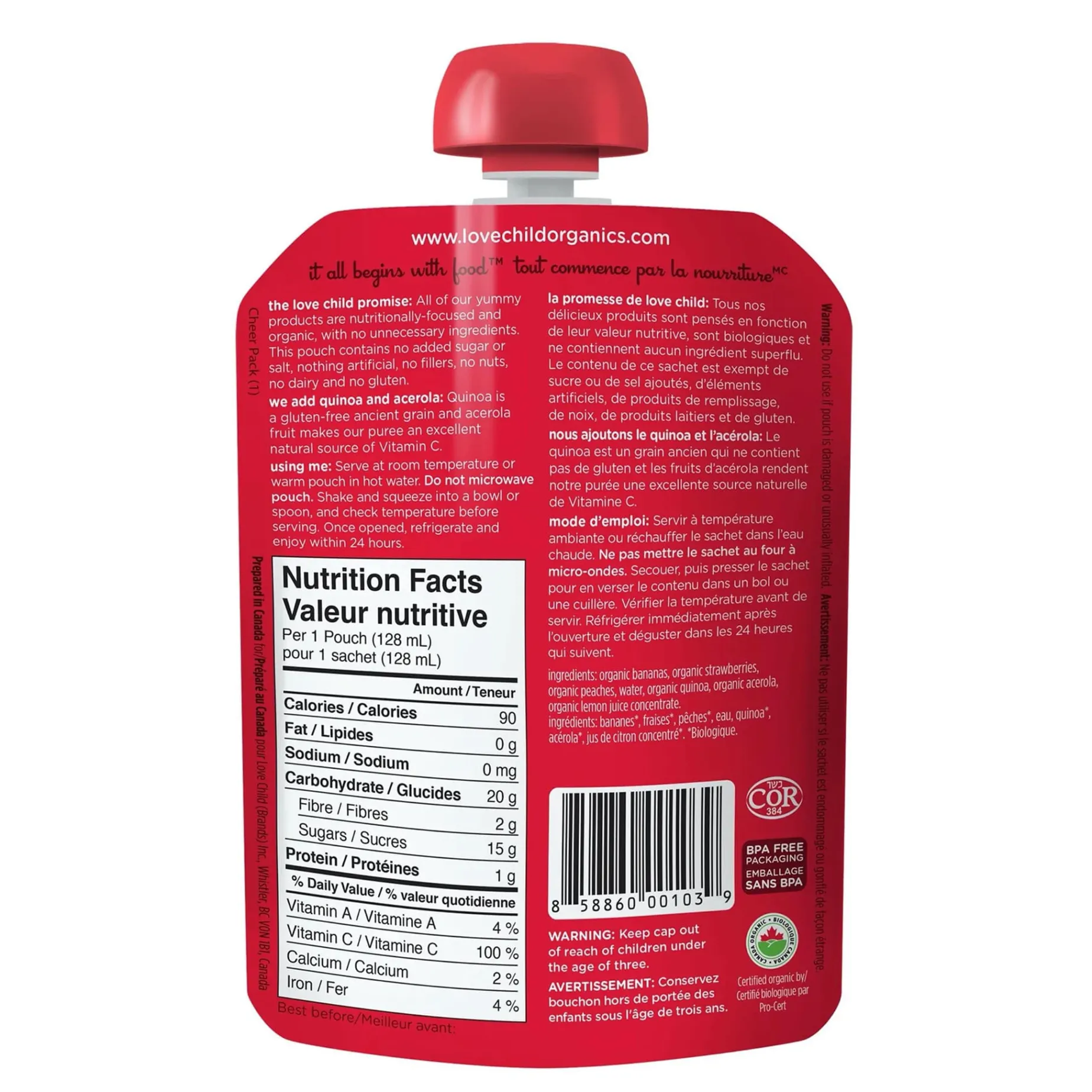 Ingredients: Organic banana puree (organic bananas, organic lemon juice), organic strawberries, organic peaches, water, organic acerola, organic quinoa, organic lemon juice concentrate.