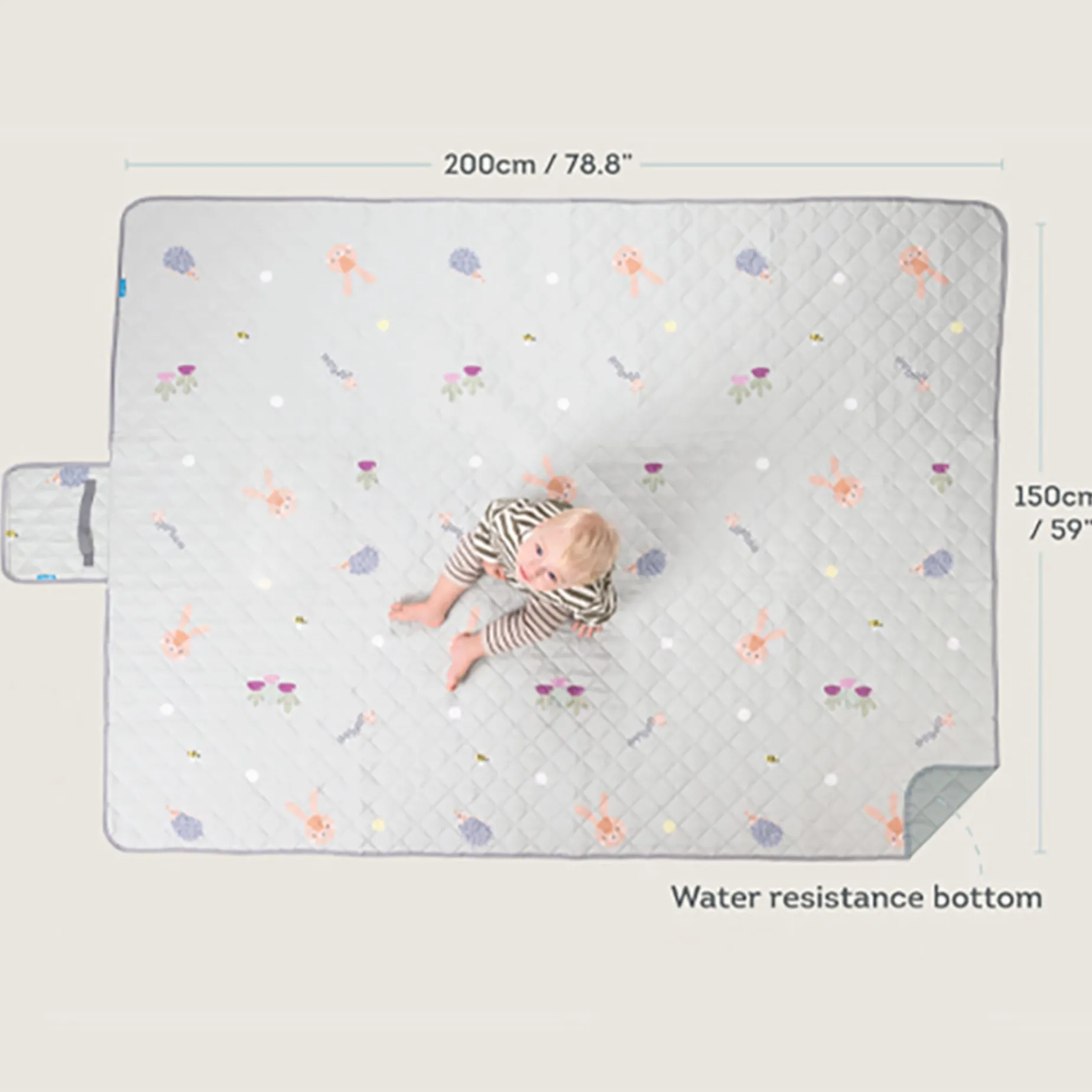 Spacious versatile and durable mat, designed for use during outdoor playtime. Features a water-resistant bottom layer and a soft top that can be easily cleaned. Suitable for children of all ages, this lightweight and easy-to-fold mat is perfect for use at the park, beach, or in your own backyard. Its XL size provides ample space.