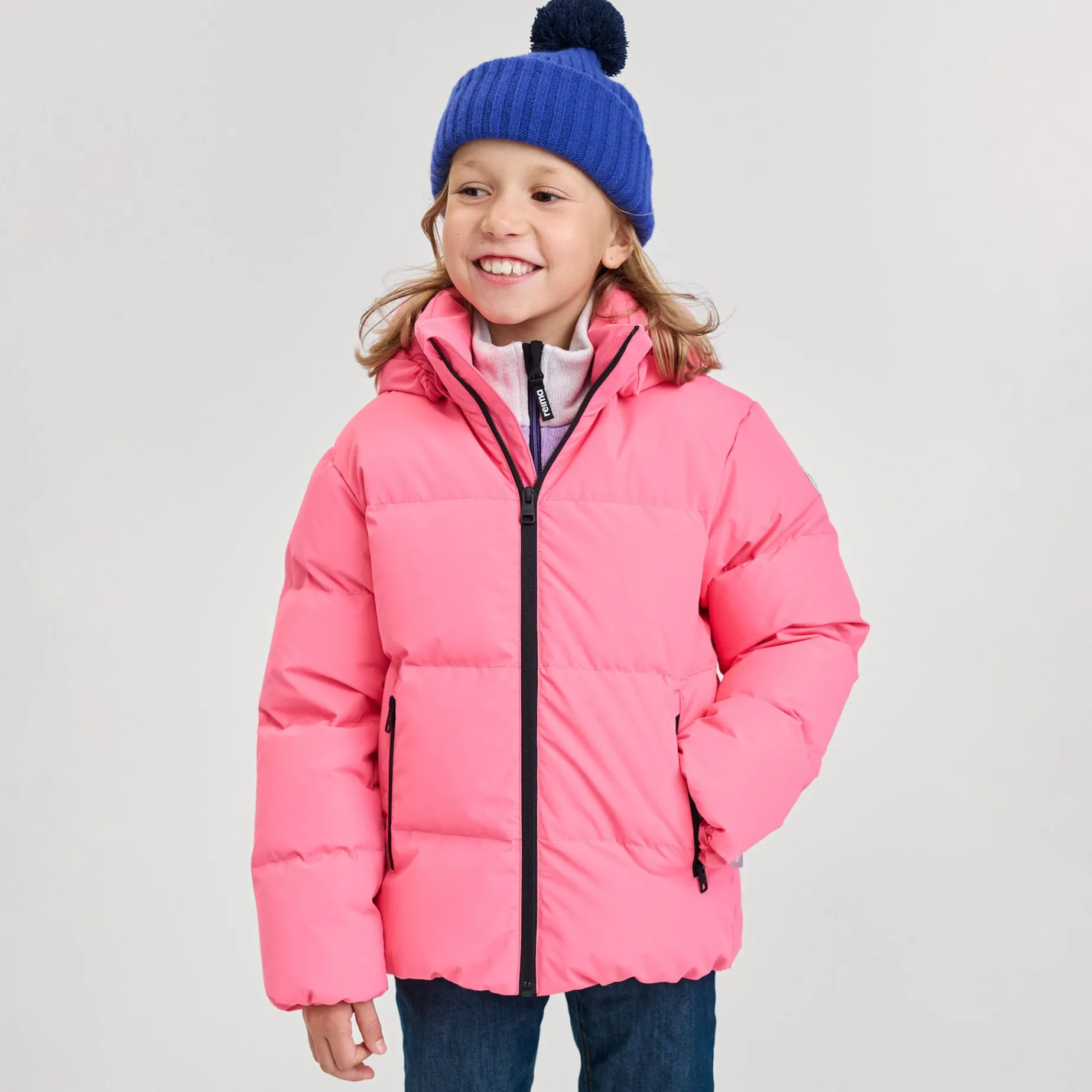 A very warm and wonderfully light puffer, crafted from recycled material that resists water. The design is water- and windproof, breathable, and dirt-repellent, with down/feather insulation (60%/40%) for exceptional warmth. It features a smooth polyester lining, a safe detachable hood, and two zip pockets. Elastic at the hem and cuffs ensures a snug fit, while excellent breathability and moisture management make it perfect for active play and sports.