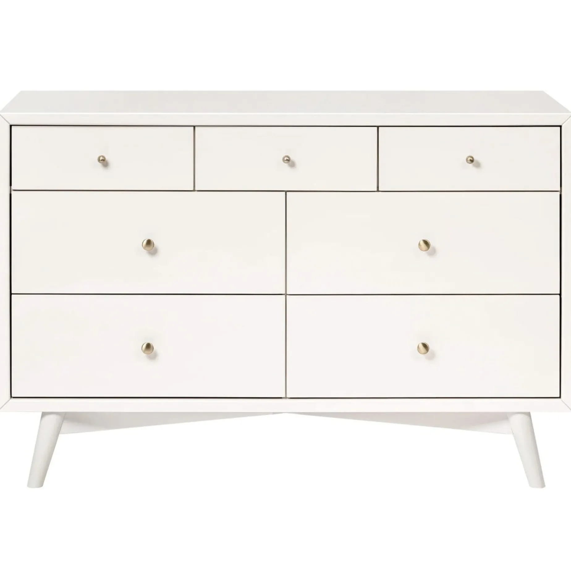 The Palma 7-drawer Double Dresser is a sophisticated mid-century inspired design with contrasting walnut stained drawers, tapered legs, brushed metal hardware, and smooth-glide drawers. It’s a versatile modern piece, providing ample storage space with three top drawers and four larger bottom drawers. Pair with the Palma 4-in-1 Crib or Peggy 3-in-1 Crib for an elegant nursery.