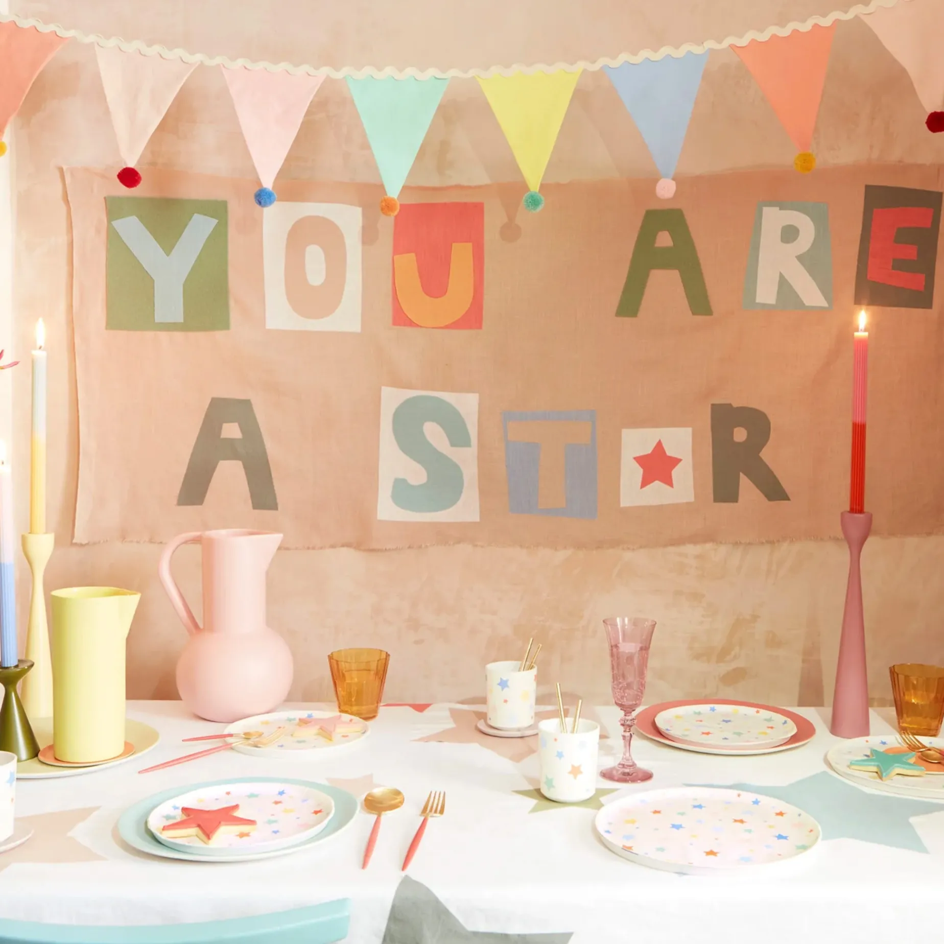 -10 Fabric pastel flags with pompoms in dusty blue, peach, pale pink, blue, coral, yellow and green