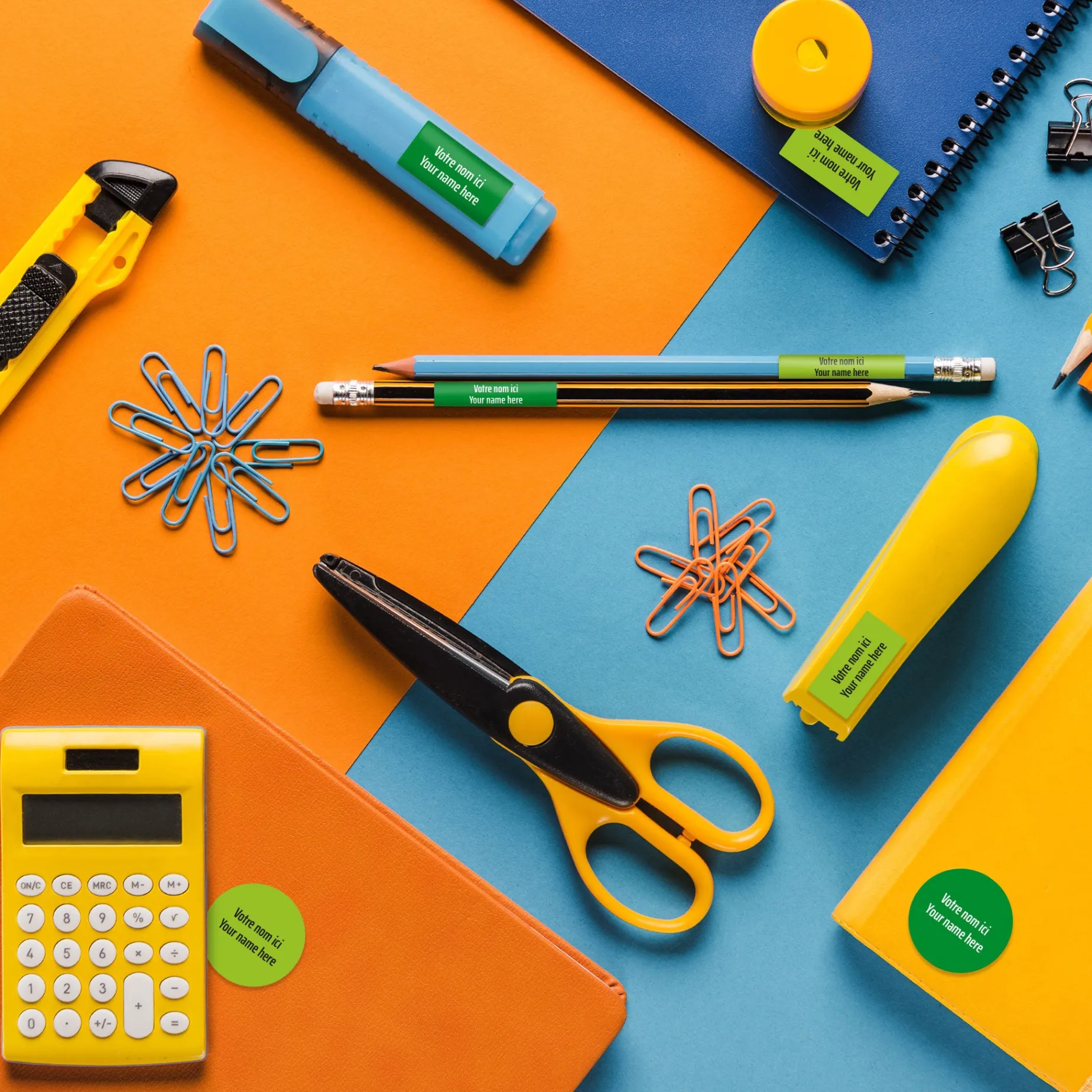 The set of personalized sticky labels ClĂ©ment becomes your best ally for the quick identification of your family’s personal items. In a few seconds, young and old will be able to recognize their school items, lunchbox items, sports equipment, shoes, clothes, etc. Waterproof and durable, the labels are not afraid of freezing, water, heat, or steam. They are resistant to the microwave, refrigerator, freezer, dishwasher, washing machine, and dryer.