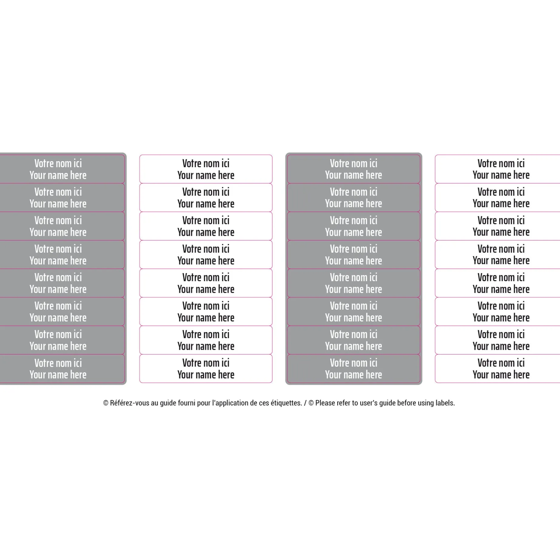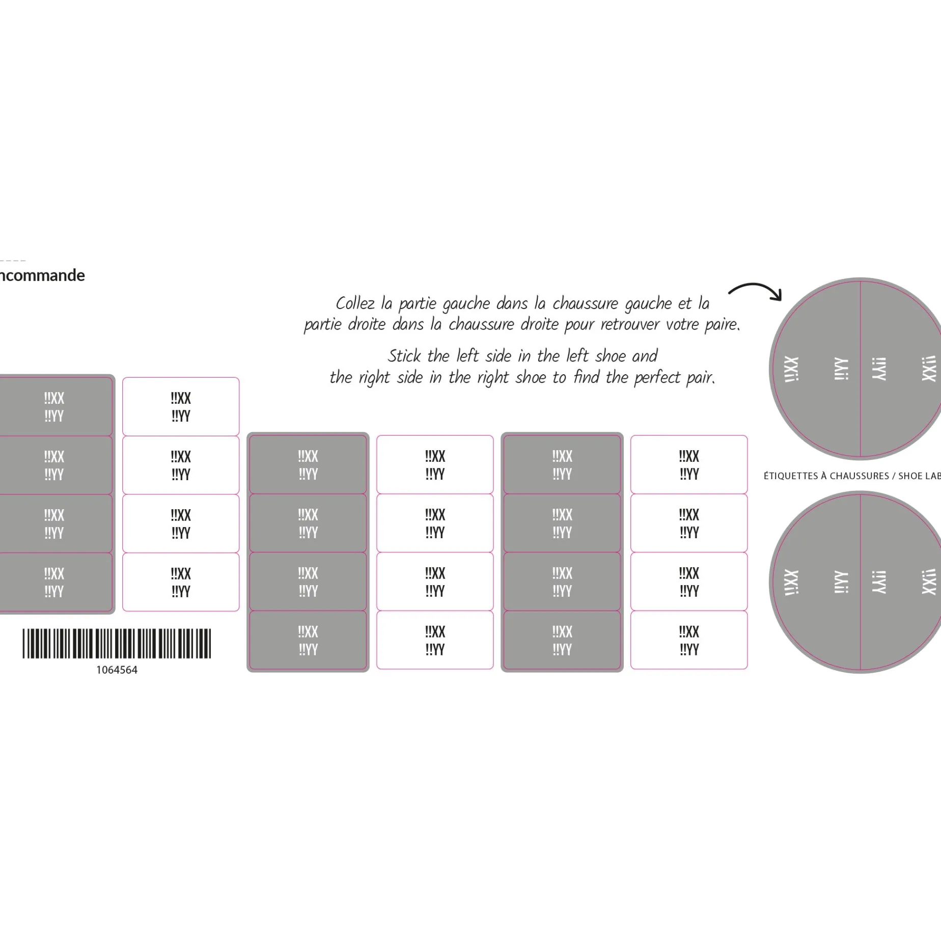 The Mini Edition is ideal for effectively identifying everyday items such as containers, clothing, shoes, and school supplies. This format includes 75 self-adhesive labels in various sizes, including 4 pairs designed specifically for shoes to help children identify the correct foot. Resistant to water, cold, heat, and steam, they are dishwasher, washing machine, dryer, microwave, refrigerator, and freezer safe. No labels require ironing: simply apply them to a clean, dry surface and wait 24 hours before exposing them to moisture or heat. The name and/or phone number is printed on two lines of 16 characters.