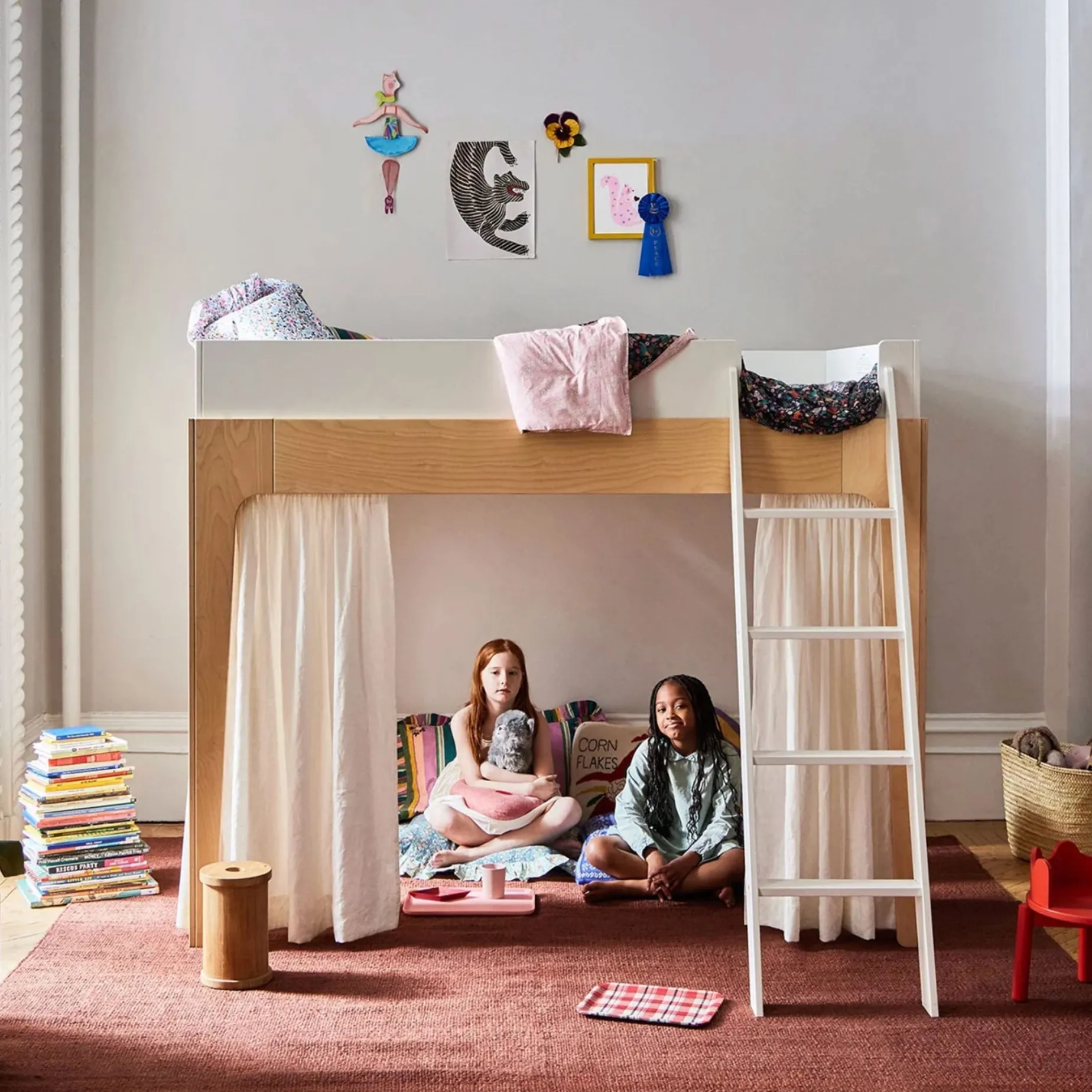 Compact footprint makes loft bed great for small spaces Brooklyn Desk, Mini Library, Toy Store fit perfectly underneath the Perch Loft Bed