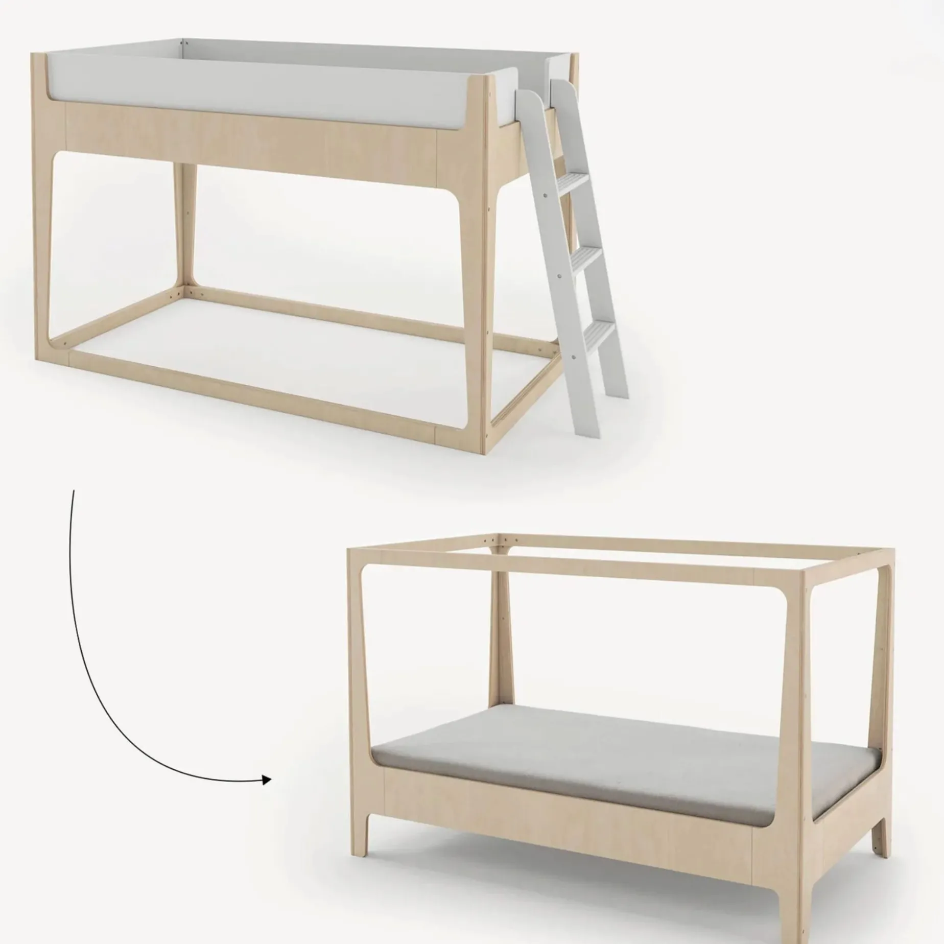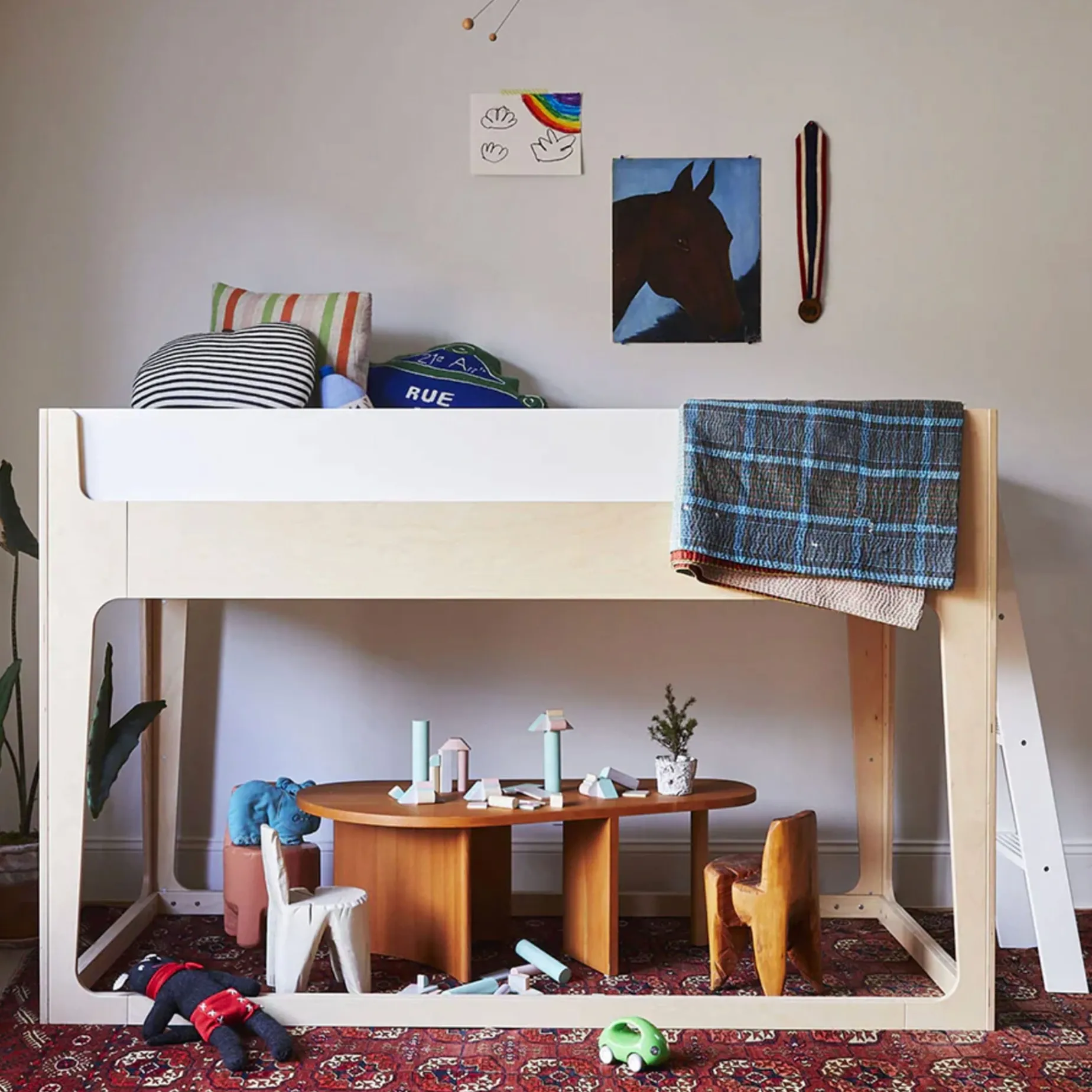 As a loft bed with ladder, children ages 6+ can sleep on the top bunk, with either a play space or a floor-level mattress below, and