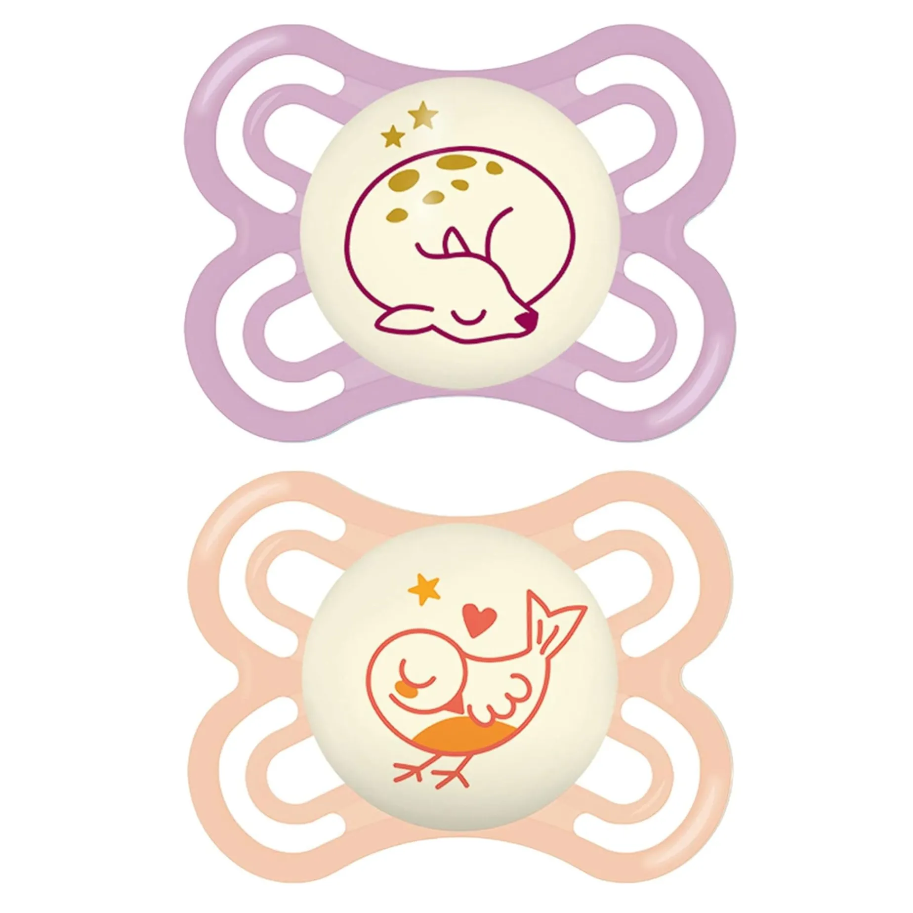 -Product details: set of 2 MAM Perfect Night pacifiers for girls, 0–6 months, with baby pacifier case and storage box.