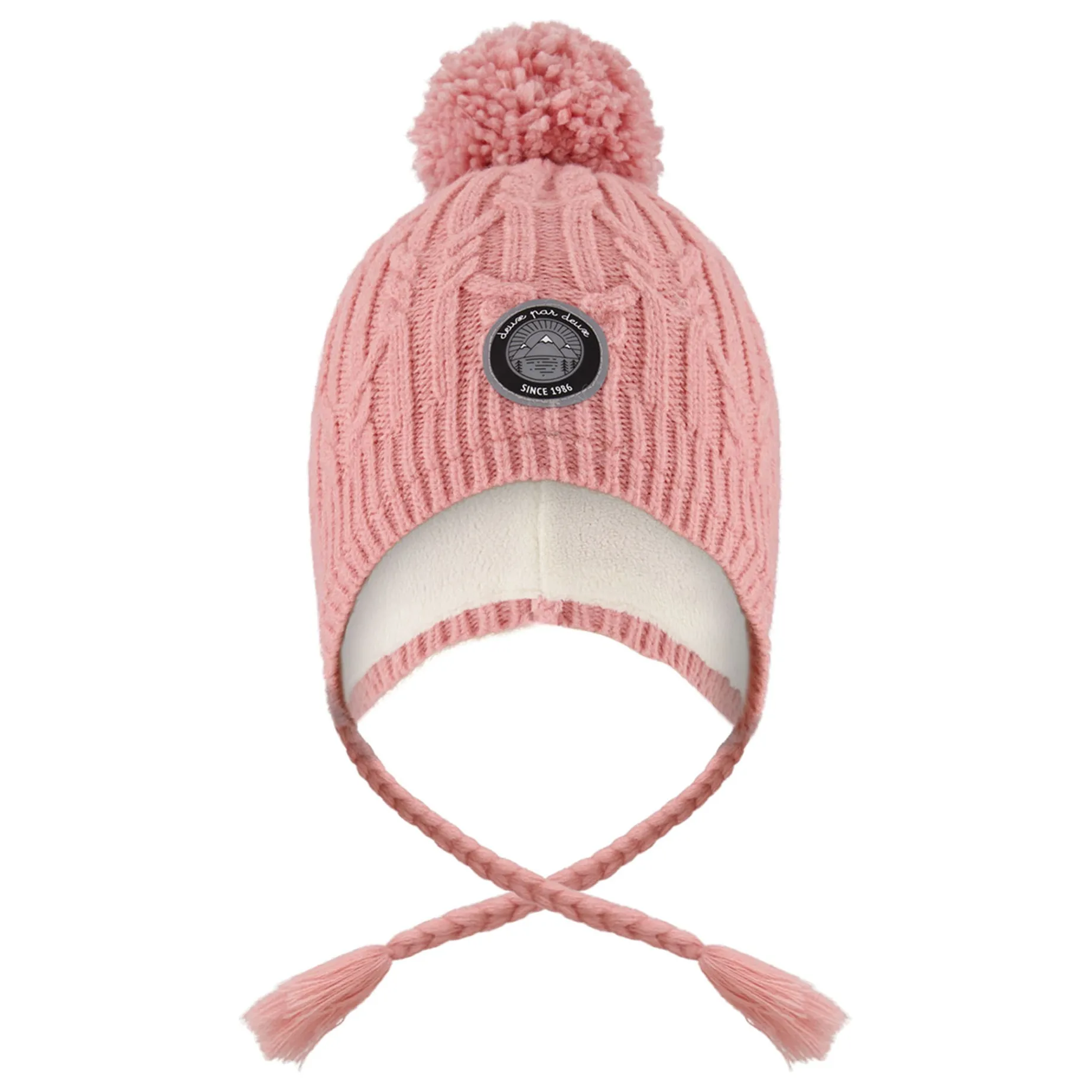 Lined with polar fleece for added warmth, this knit cap in off-white is winter weather-approved. In a Peruvian silhouette with extended side panels that cover and protect the ears, this winter hat features a chunky cable knit texture, braided side tassels, a fluffy pompom, and a logo patch for brand distinction.