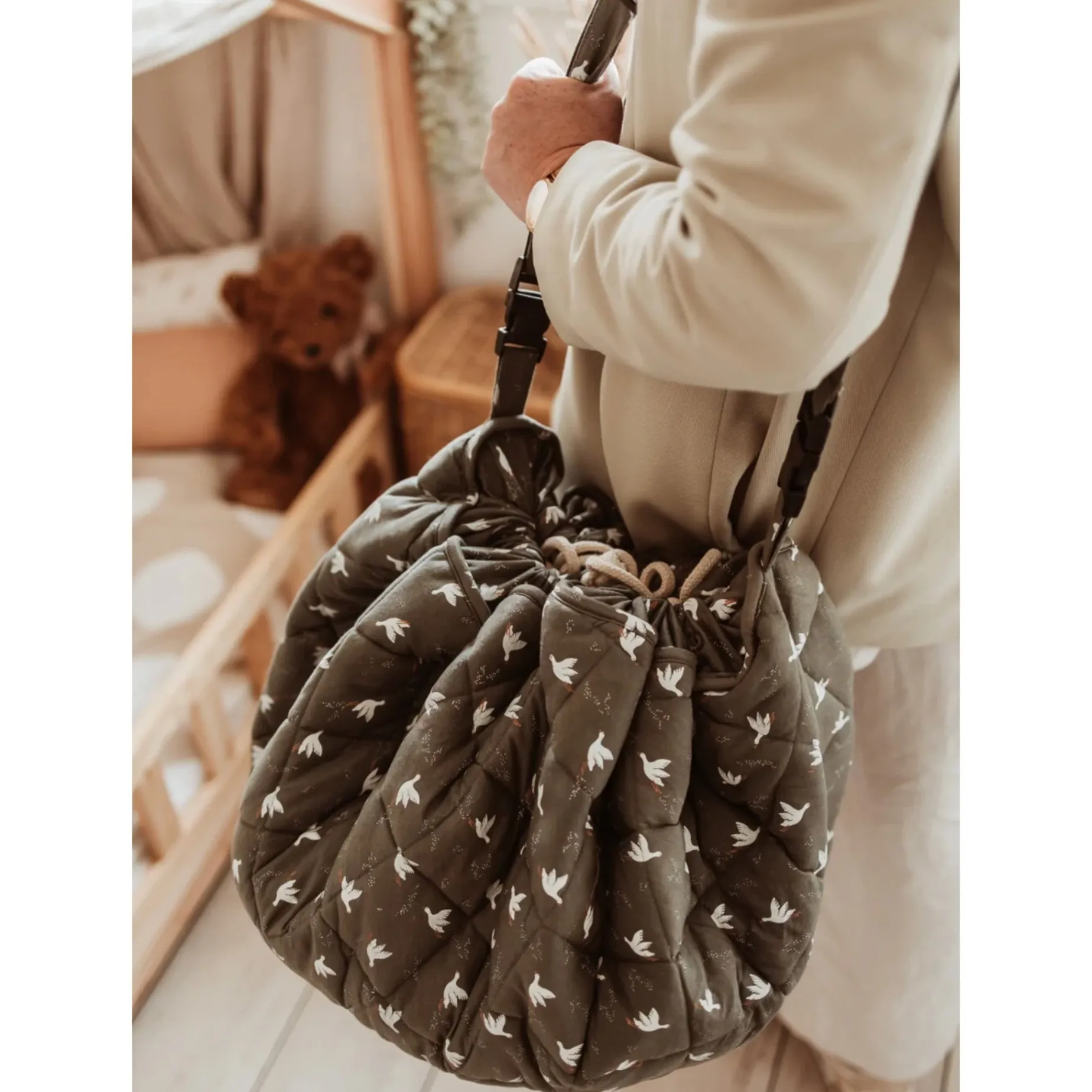 – 3-in-1 baby play mat, toy storage bag, and diaper bag