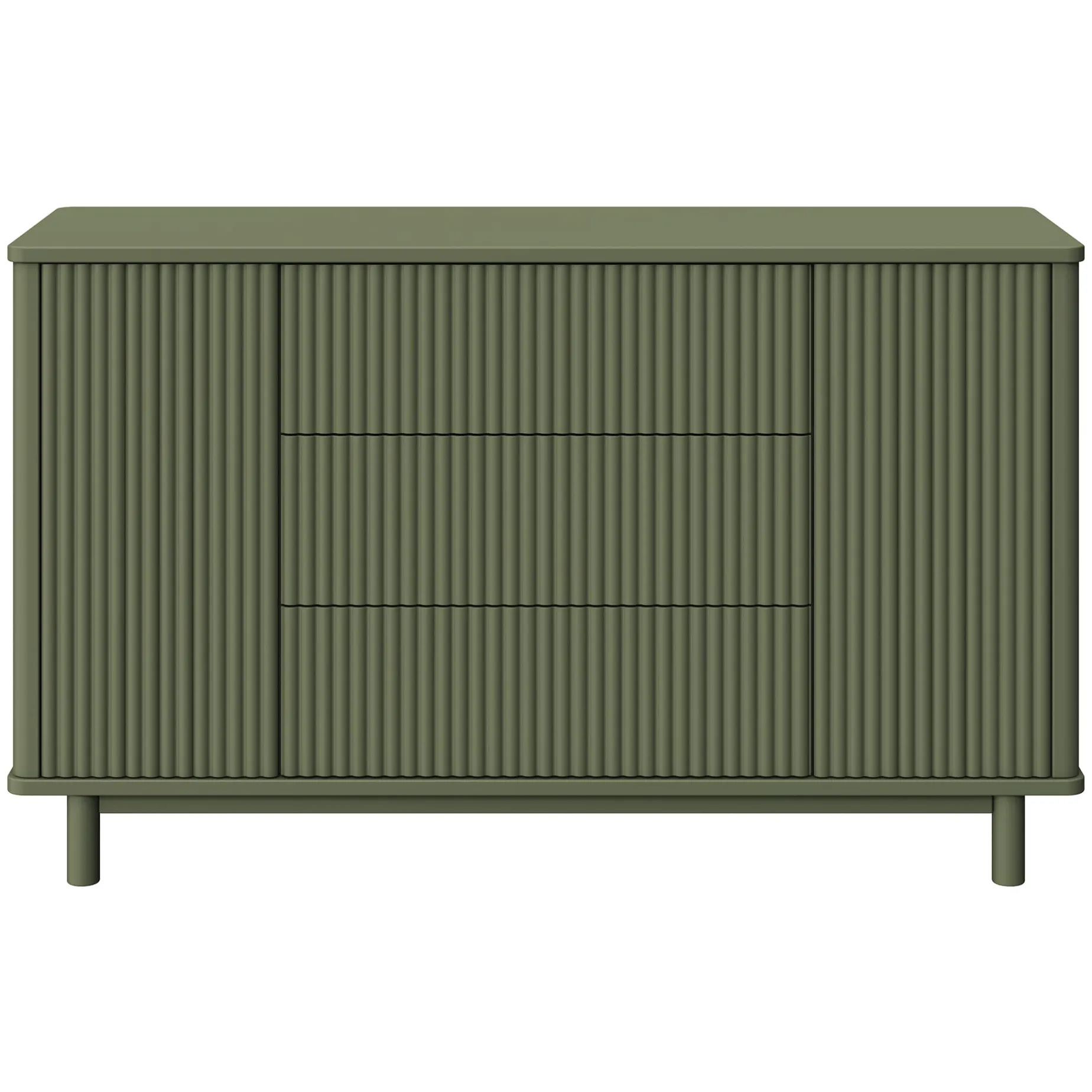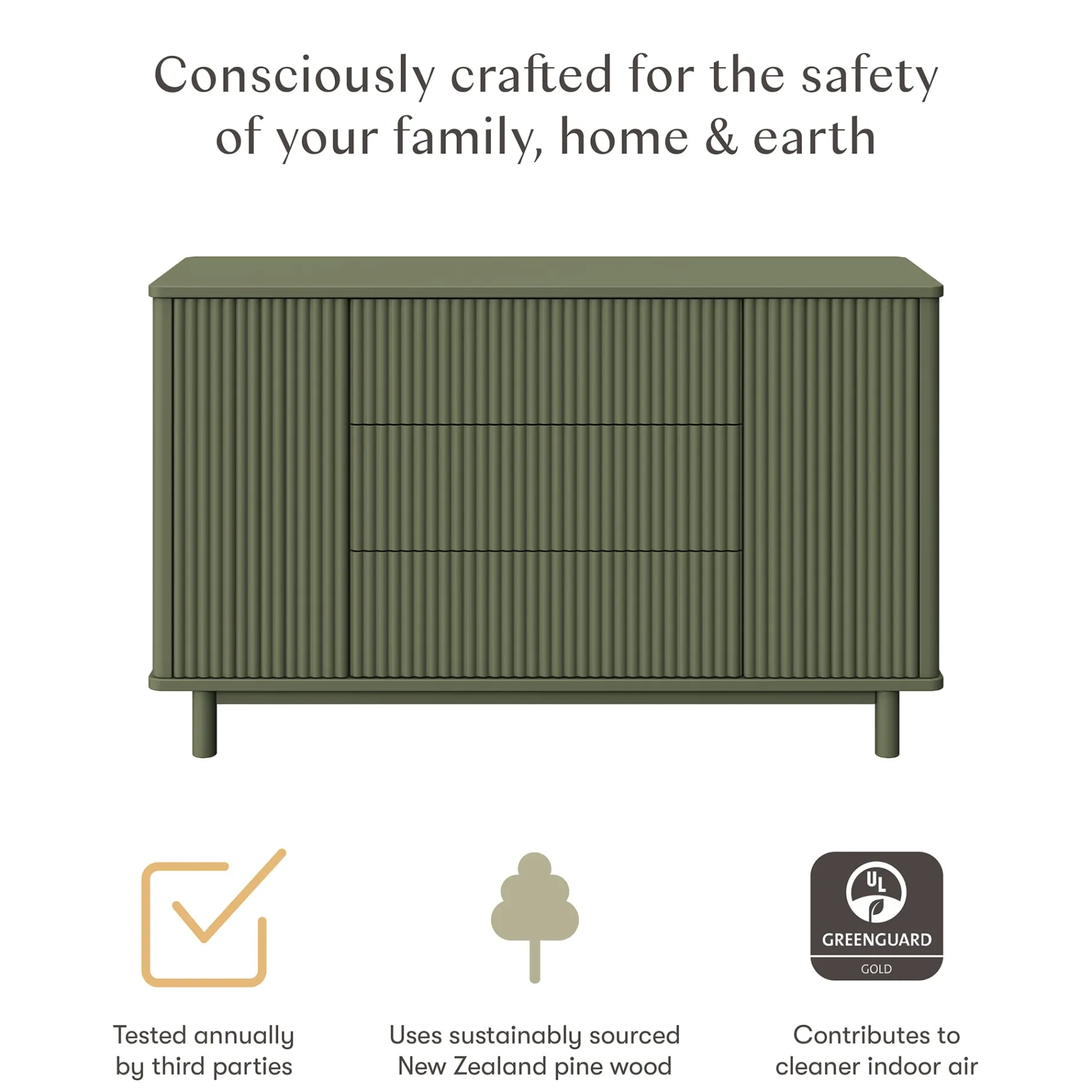The timeless Pogo Tambour Assembled Dresser exudes modern elegance with its textured fluted tambour paneling, smooth, rounded edges, and elevated silhouette. Designed for the nursery but beautiful enough for use throughout the home, it features push to open smooth-gliding drawers, spacious side cabinets, included anti-tip kit for safety, and best of all, it arrives fully assembled, ready out of the box.