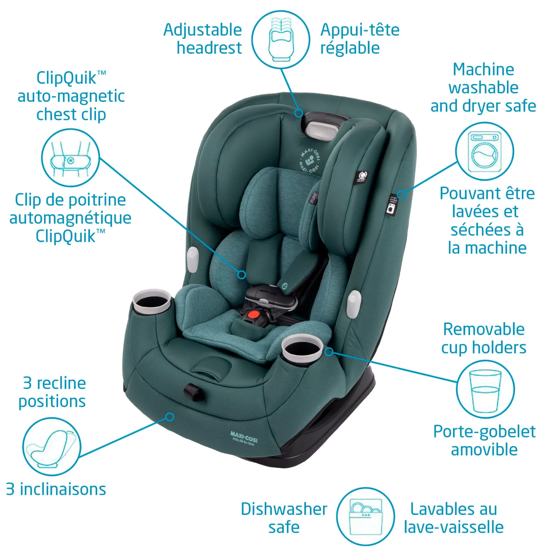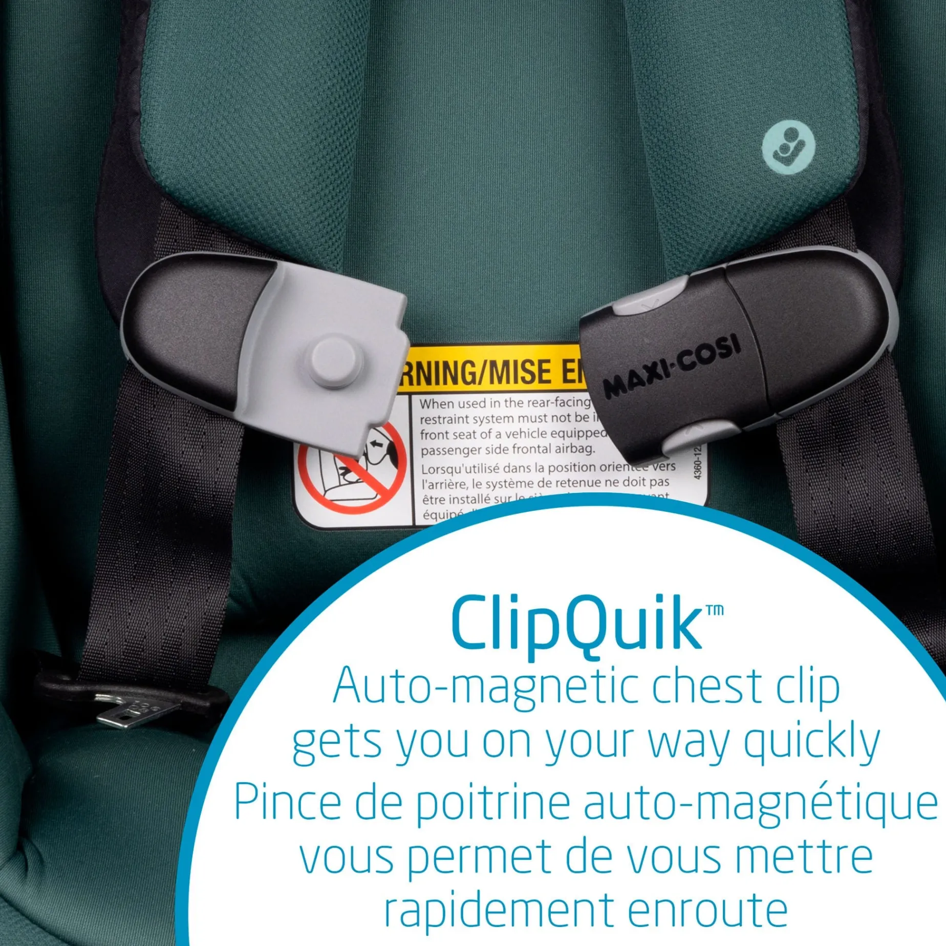 -ClipQuik™ auto-magnetic chest clip gets you on your way quickly. Kids won’t be able to unclip this chest clip! In and out harness holders keep straps out of the while getting in and out of the seat or while buckling.