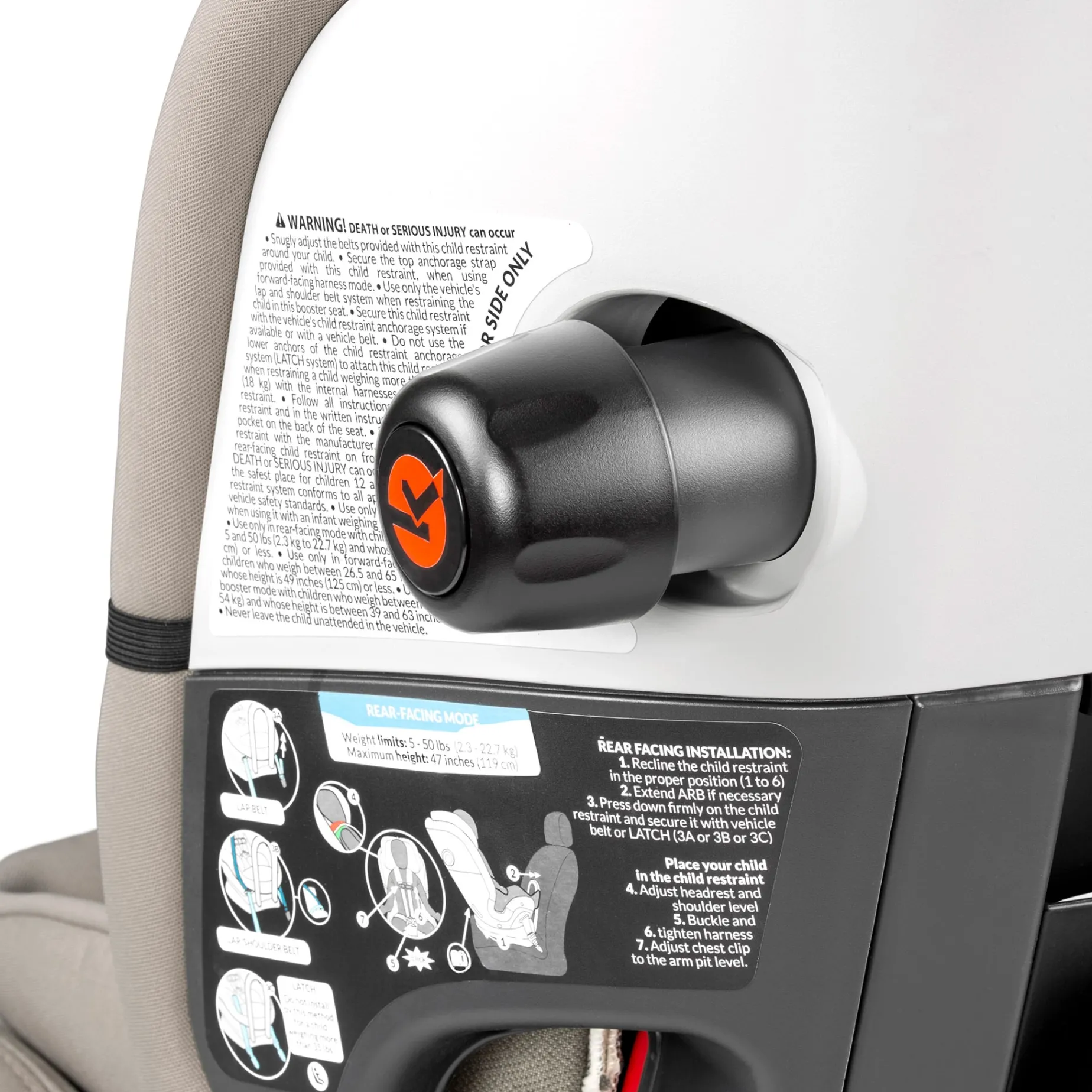 -Easily removable upholstery quickly unzips and is machine washable. Integrated LATCH and TOP TETHER straps offer the safest way to attach the seat to the vehicle and can be stowed away when not in use. Easily adjusts to 12 postitions, even with the child in the seat, ensuring the best and safest fit.
