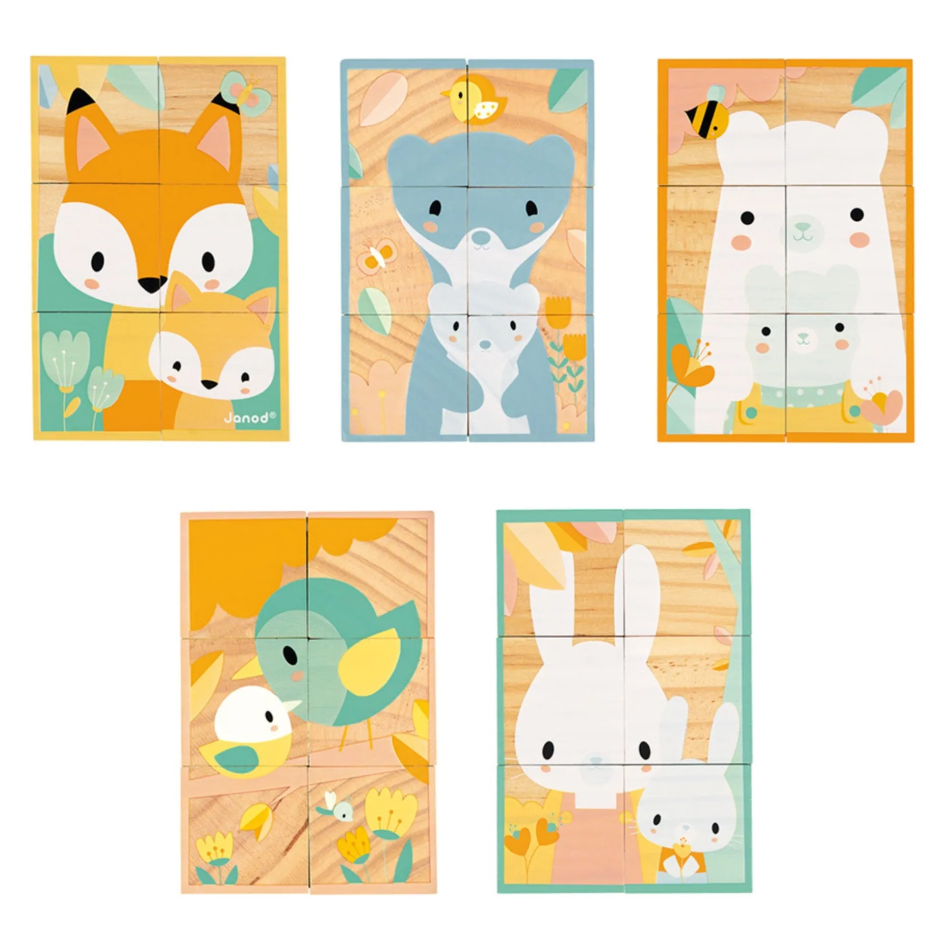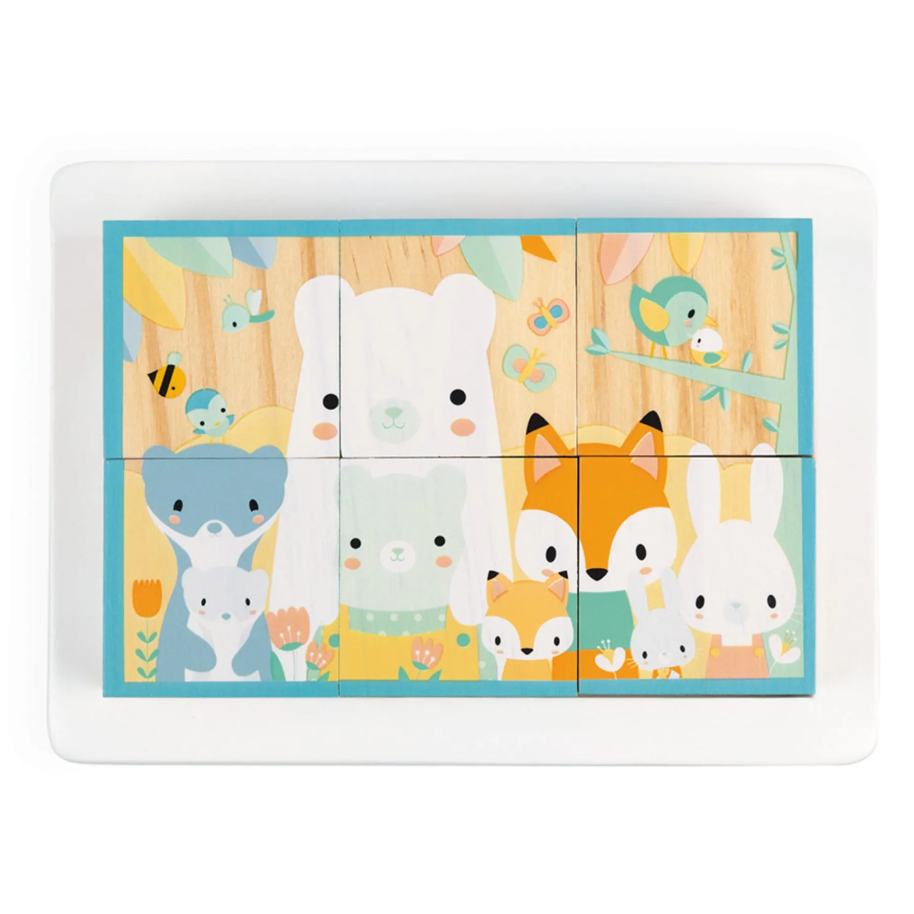 What lovely solid wood blocks for babies! We love the sweet forest animal illustrations, printed in very soft tones on the natural wood. This beautiful early-learning game from the Pure collection provides baby with an introduction to manipulation toys and once accustomed to the shapes, they can attempt to reconstruct the scenes on the 6 blocks. They will discover the 6 animal portraits with their babies, each one cuter than the next: bear, fox, rabbit, weasel, deer and a scene where they are all gathered together. As part of this early-learning construction game, children will be encouraged to develop their coordination, observation skills and their visual memory.