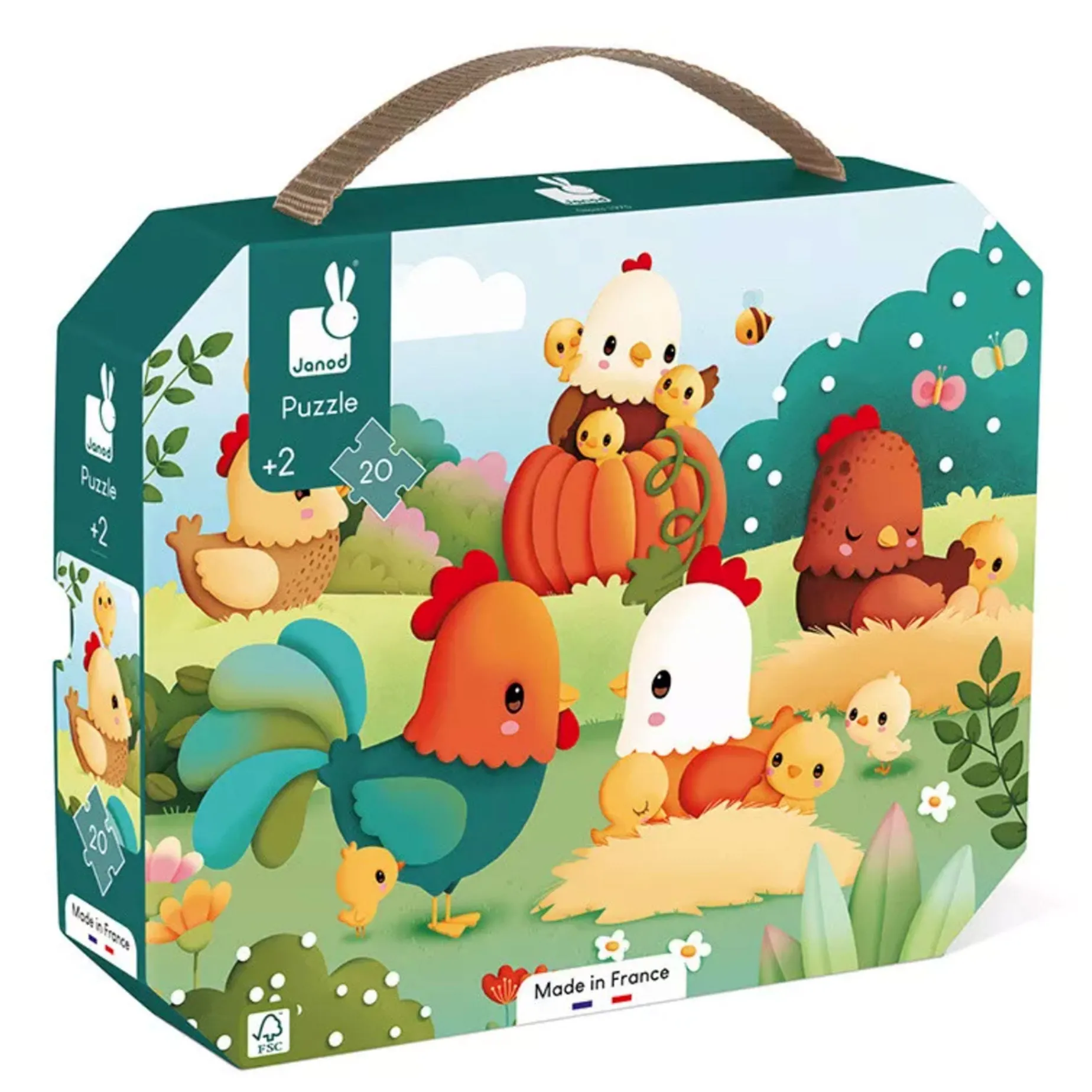 What do you say to a walk in the countryside? Thanks to this 20-piece puzzle with a farm, or more precisely, barnyard theme, children aged 2 years and up are sure to have a great time! Puzzles are a great way for little ones to work on their concentration, logic and being calm, whilst developing their motor skills. For this exact reason, the farm puzzle comprises 20 large pieces which can easily be grasped by our apprentice farmers for the day! Furthermore, a poster serving as a model is included with the puzzle: little ones can complete it at their own pace, with or without help. Once playtime is over, store all the pieces in the beautifully-decorated carry case. Besides, let’s not forget the stars of this cardboard puzzle: the chickens! Naturally, the rooster is the centre of attention and the chicks are being mischievous in the name of entertaining baby. Have fun counting them, describing their actions and teaching your toddler the names of these staple barnyard animals! This puzzle made in France is made from FSCâ„¢-certified cardboard and decorated with vegetable inks.