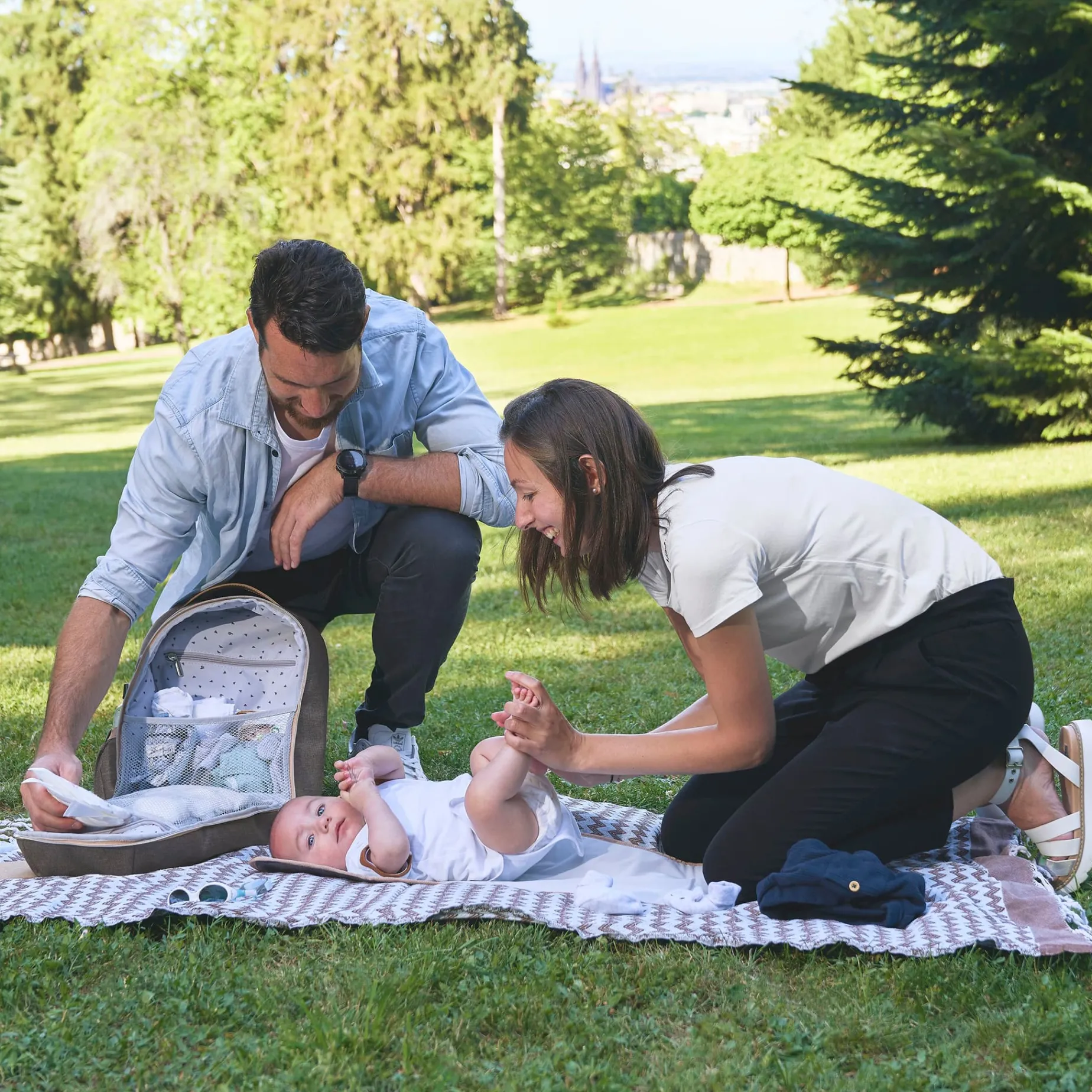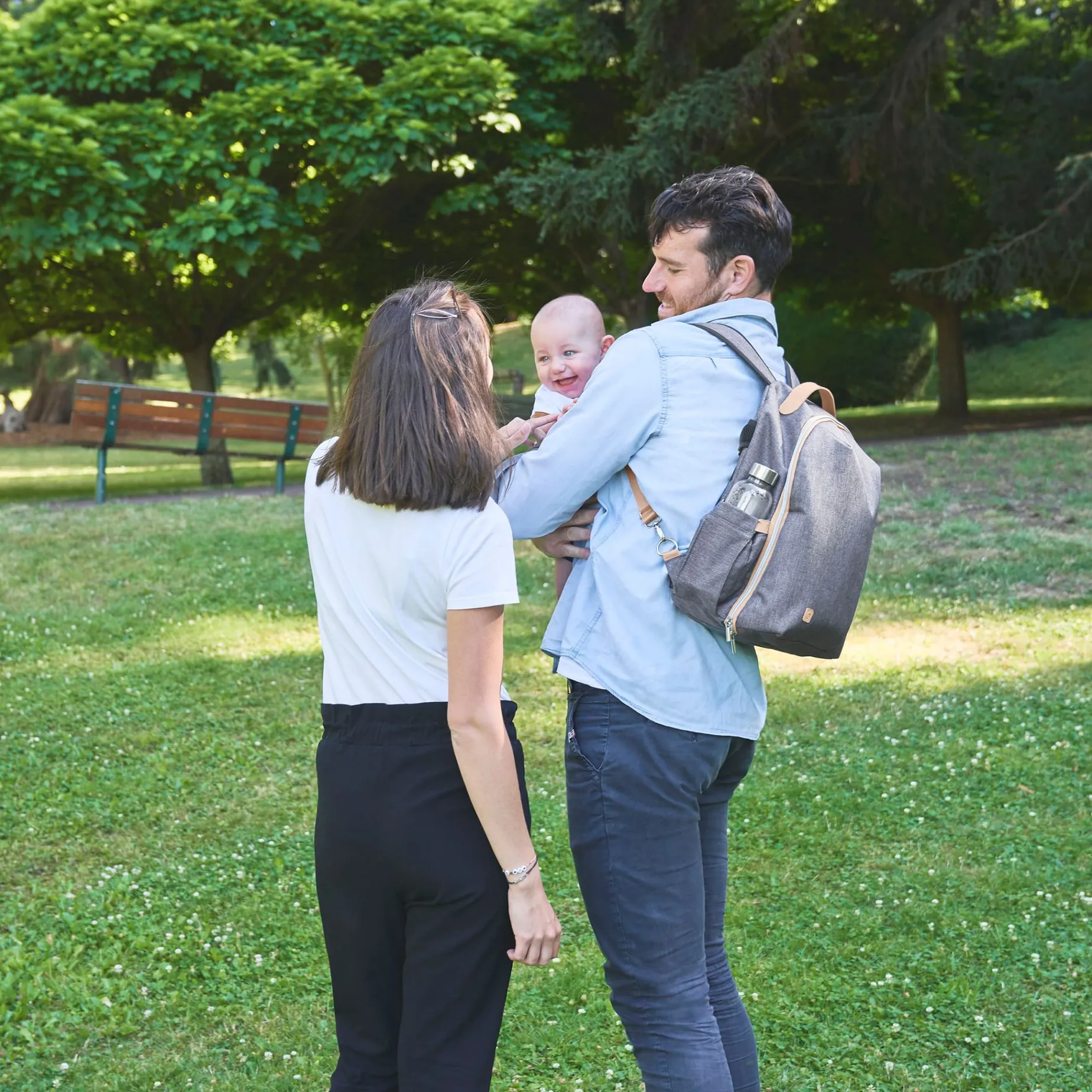 Water-repellent fabric ensure protection in wet weather. Essential Backpack has a 180° suitcase-style opening, making it very easy to fill with easy access to changing essentials. No more rummaging for a dummy or wipes at the bottom of the bag! Really practical to take anywhere with you, the Essential Backpack also has slots on the back so that it slides easily onto a telescopic suitcase handle.