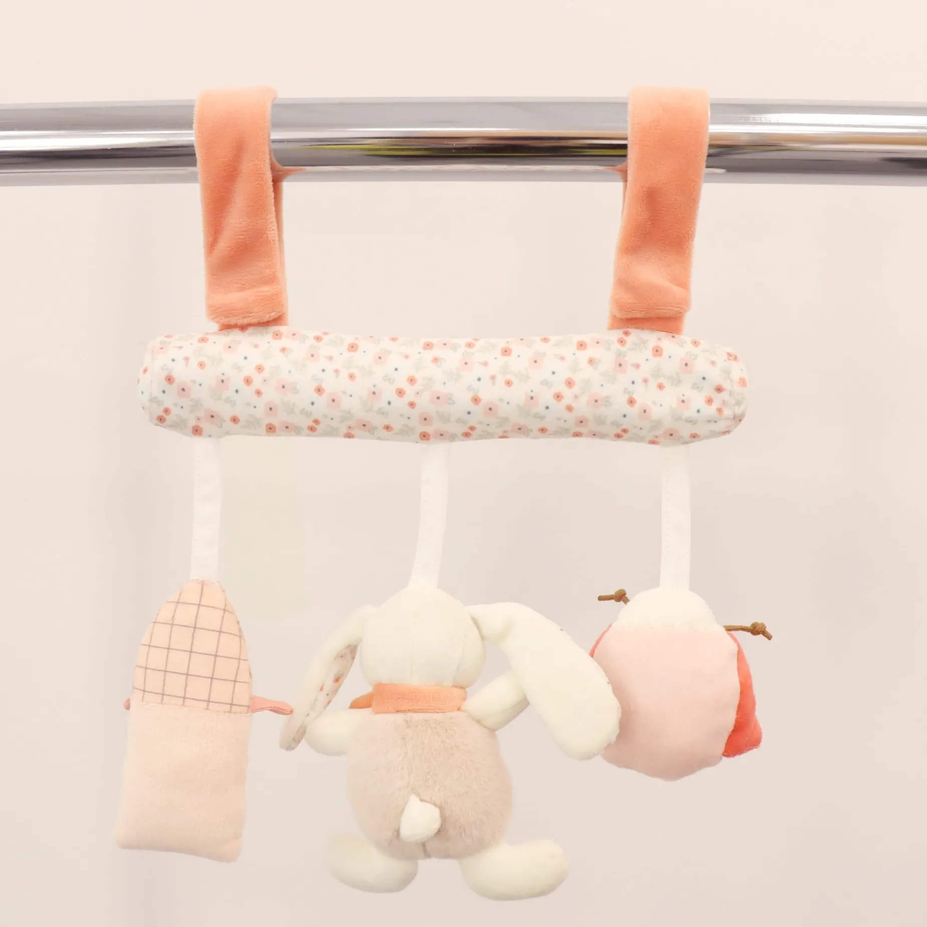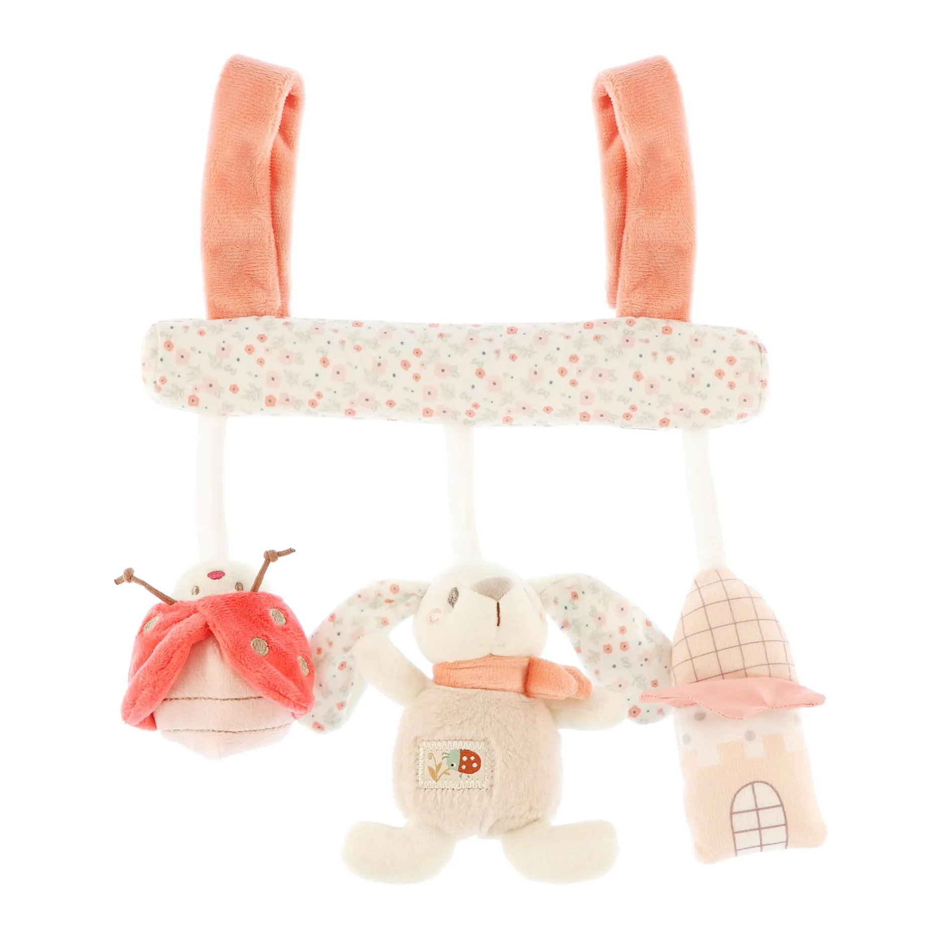 -Includes three hanging characters: a ladybug, a rabbit and a castle, to entertain and captivate baby