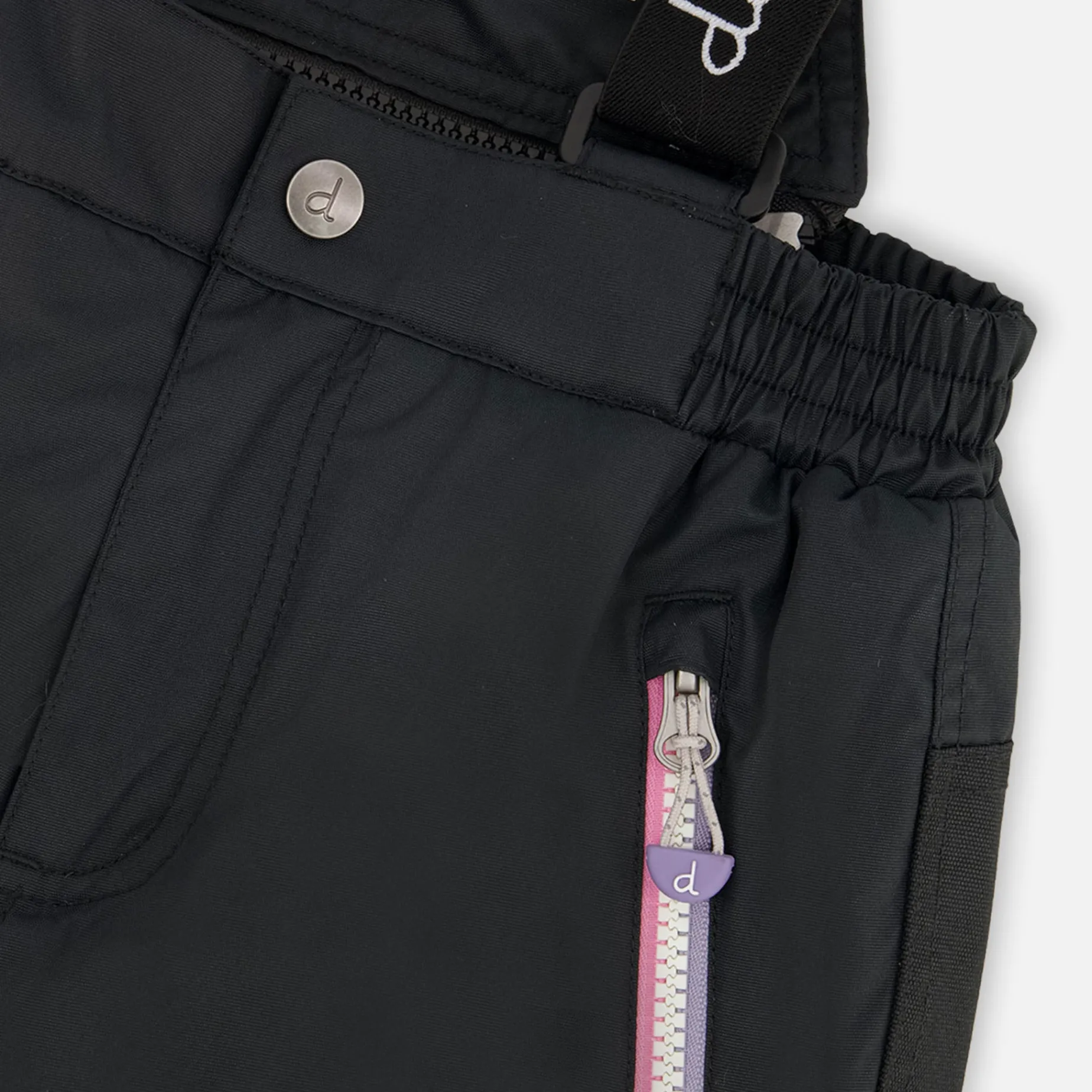 -Pants with elastic waist and removable, adjustable suspenders. Includes 2 zippered side pockets. Ankles with snow guards and rubberized elastic band.