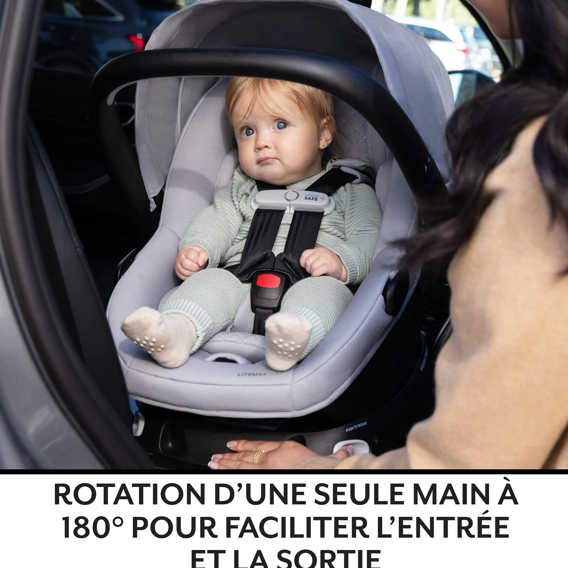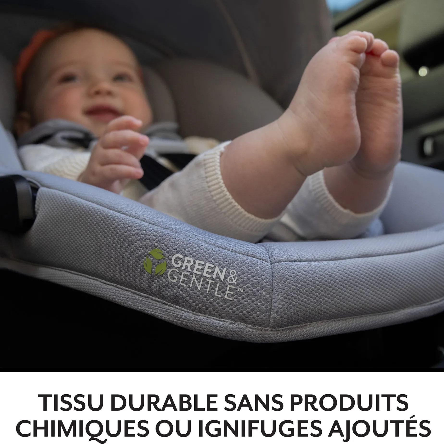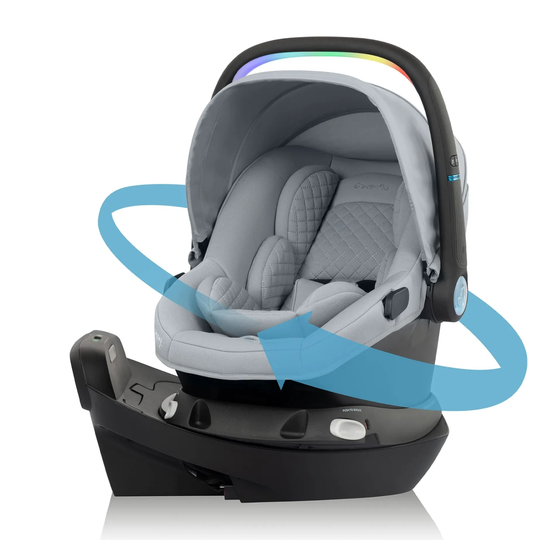 The Evenflo® Revolve180TM LiteMaxTM NXT Rotational Infant Car Seat with SensorySootheTM technology has it all. For infants weighing 3-22 lb (15.7-32 in.), this car seat offers one-hand, 180° rotation for easy in and out. SensorySoothe technology engages and calms your baby with lights, music and sounds integrated into the infant car seat handle. Cue a mesmerizing light show via the Evenflo app on your phone! SensorSafe® technology adds a layer of protection for peace of mind, alerting you to 4 potentially unsafe conditions from your child’s car seat. LockStrongTM belt tensioning system provides solid, secure installation in no time, while SecureTightTM technology helps you achieve a tighter installation with up to 50% less effort. Soft, sustainable Green & Gentle™ Fabric is woven from recycled plastic bottles, free of added chemicals and flame retardants — one more thing you can feel good about. Compatible with adjustable SafeZone™ Load Leg accessory, adjustable support leg with easy-to-read indicators which helps stabilize the seat base by limiting rotation and reducing crash forces (sold separately).