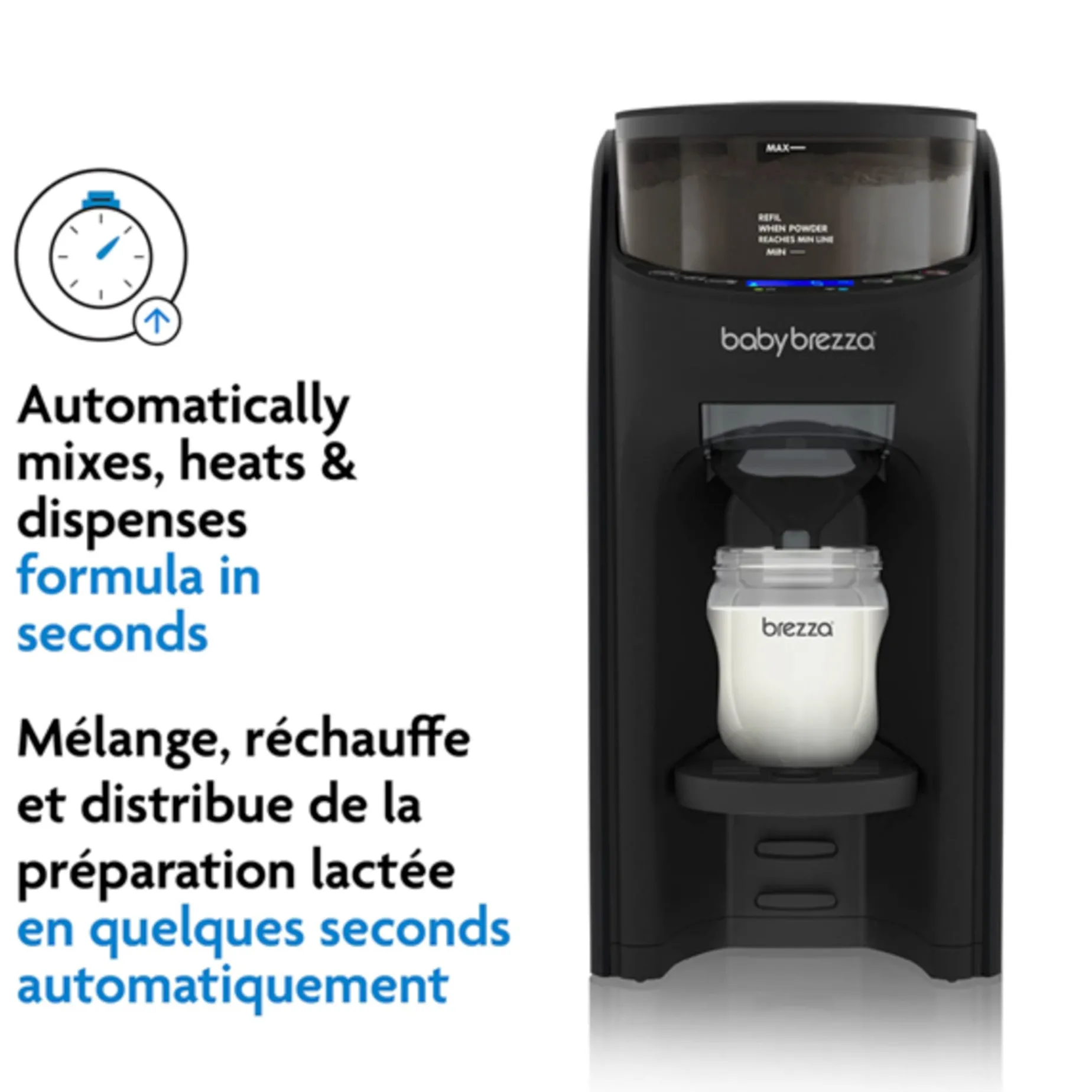 Stores formula in airtight powder container. Dishwasher-safe water tank.