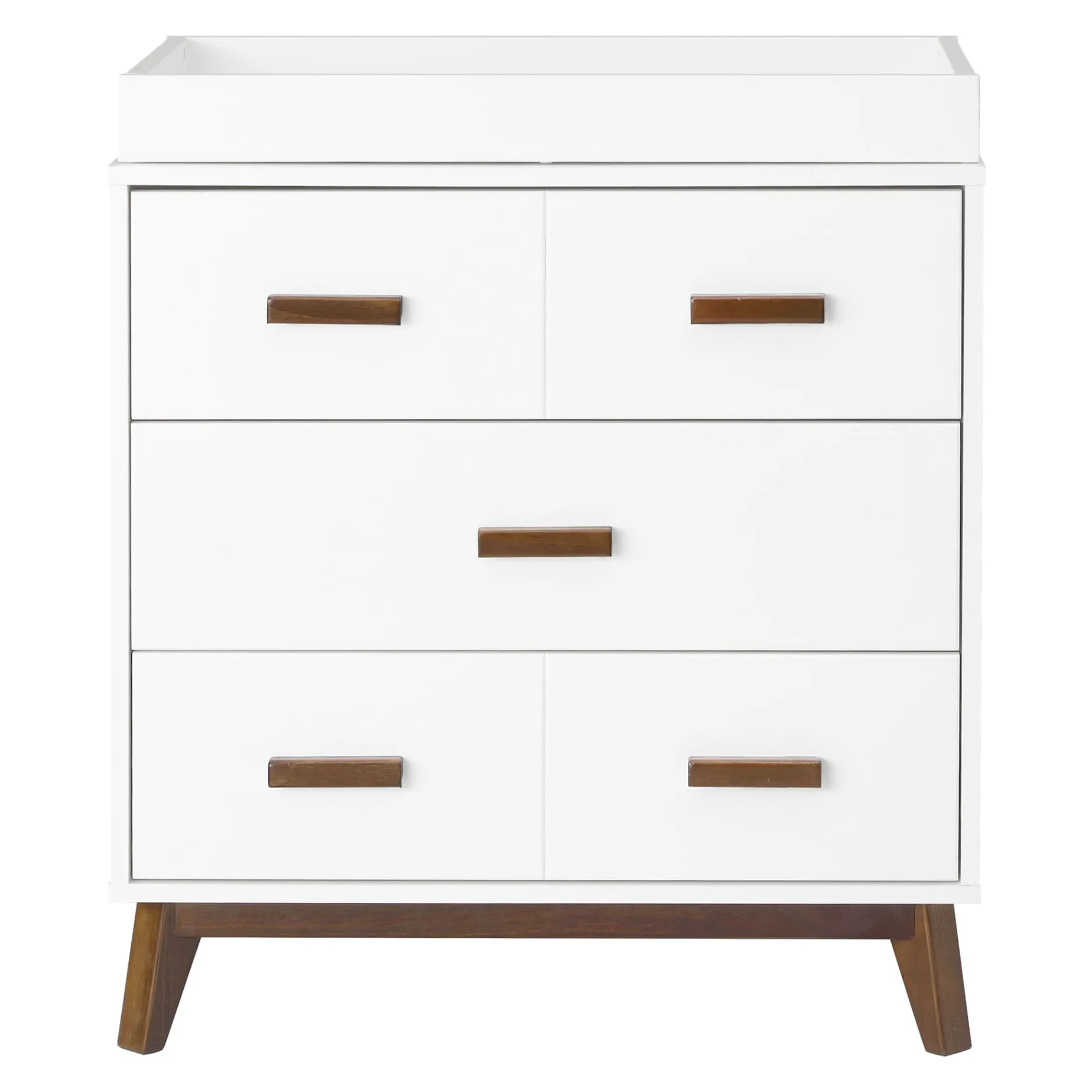 The Scoot 3-drawer Changer Dresser is the definition of mid-century modern style. The perfect accompaniment to your Scoot 3-in-1 Crib with matching tapered feet and two-toned or solid color detailing. With three smooth-glide drawers and an included removable changing tray, this compact unit provides a range of practical storage possibilities to suit all of your nursery needs.