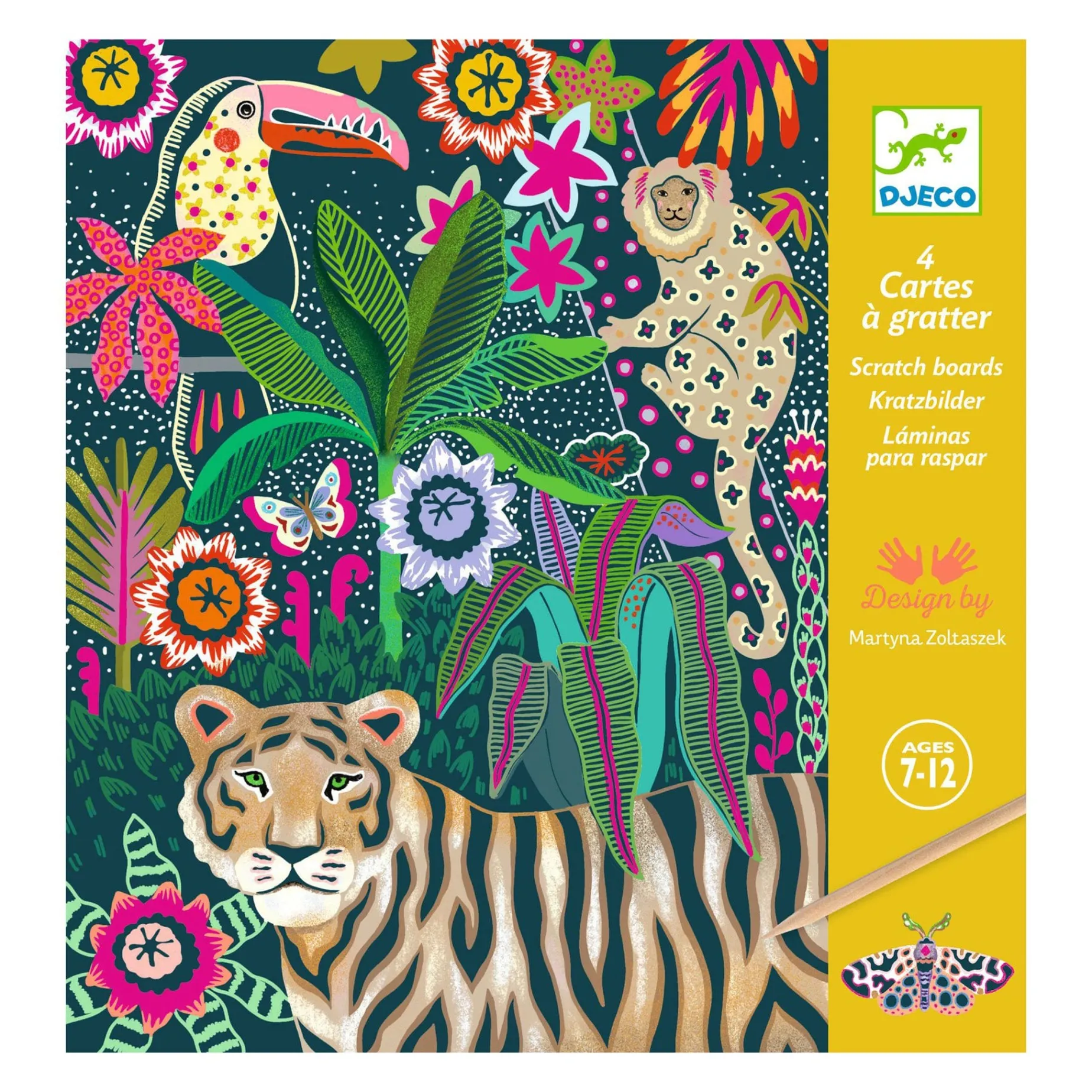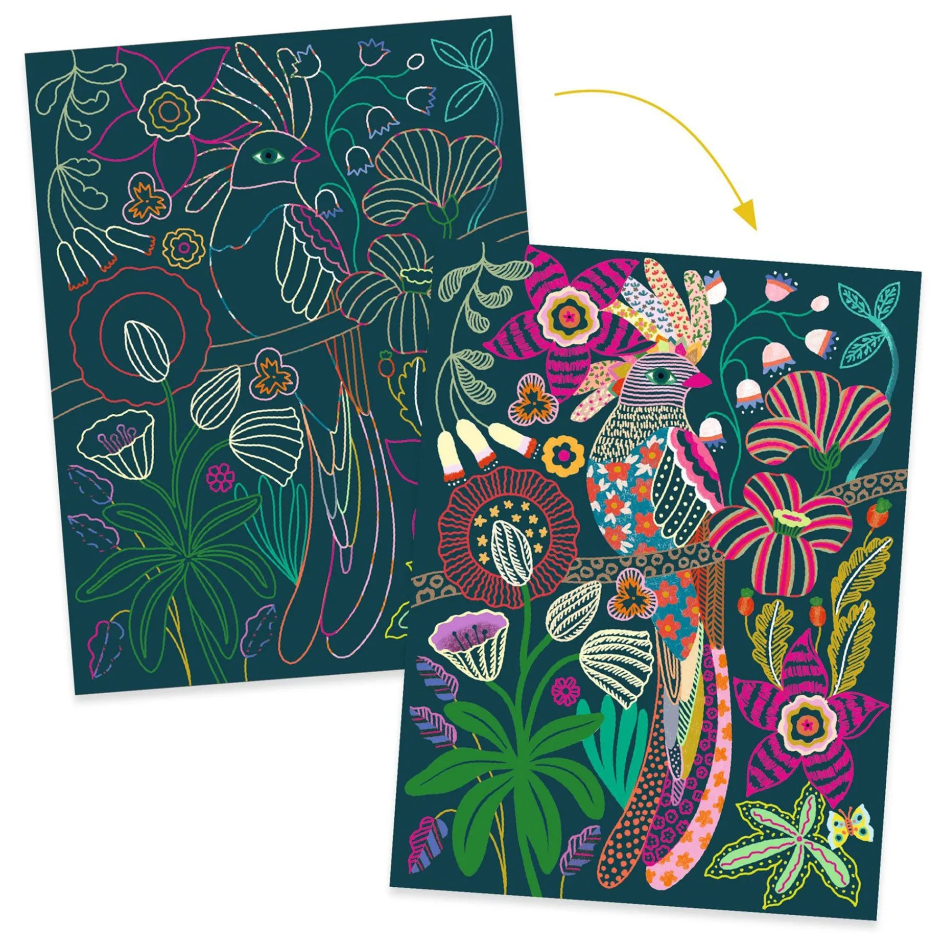A set of 4 scratch cards with fluorescent colors in a vibrant atmosphere. The child reproduces the patterns imagined by the artist by scratching the surface with the wooden stylus. Gradually, the illustrations are revealed as if by magic!
