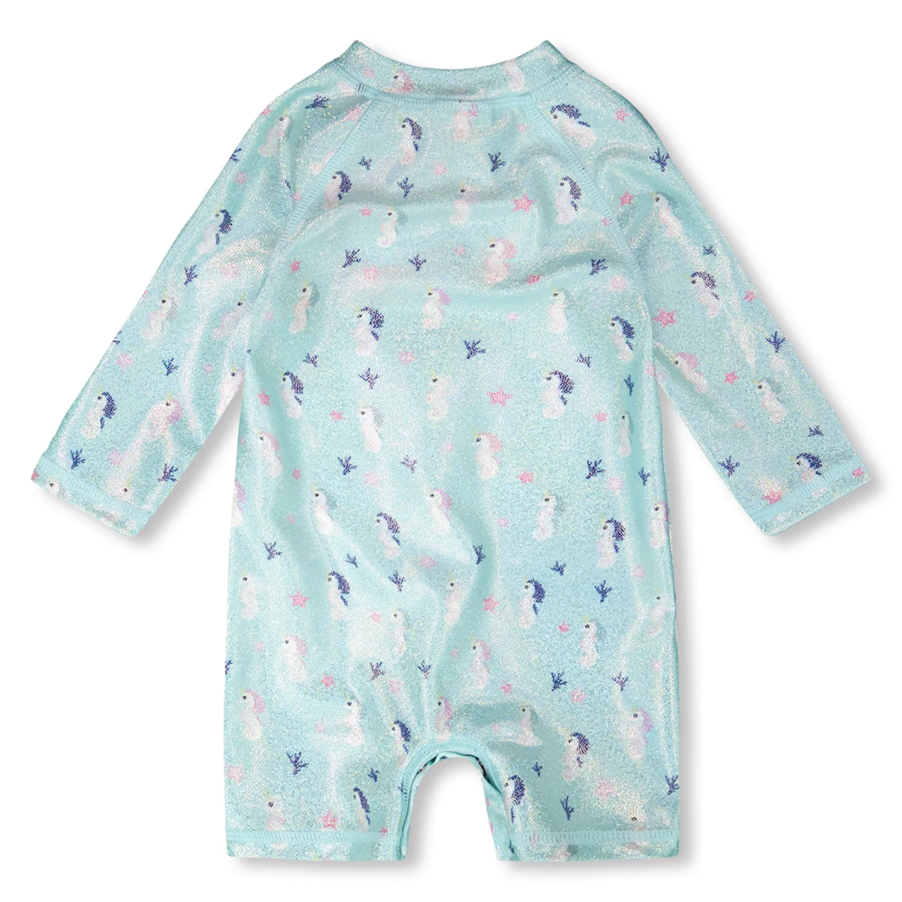 The baby and toddler one-piece long sleeve rashguard in blue with seahorse print is a playful essential for little girls at the beach or pool. This long-sleeve swimsuit features an allover seahorse print on a soft blue background, a mock neck, bottom-snap closure and a front zipper for easy dressing. Made from recycled polyester with added stretch, it offers sun protection, comfort, and style for splashing around all summer long.