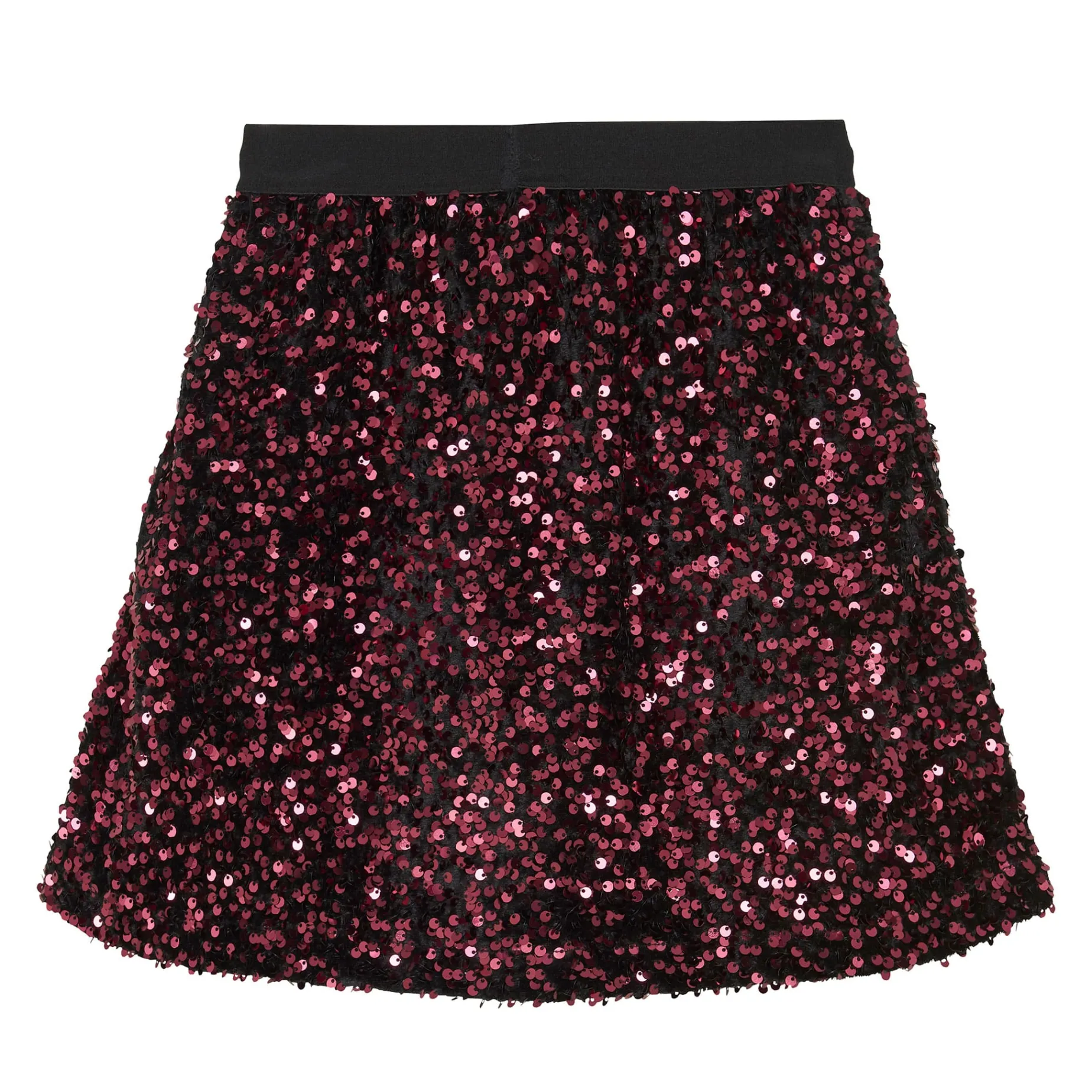 Beautiful red sequined skirt from Creamie. There are sequins sewn onto a base of black velour. The skirt has a soft and extra wide elastic edge at the waist, which ensures a good fit