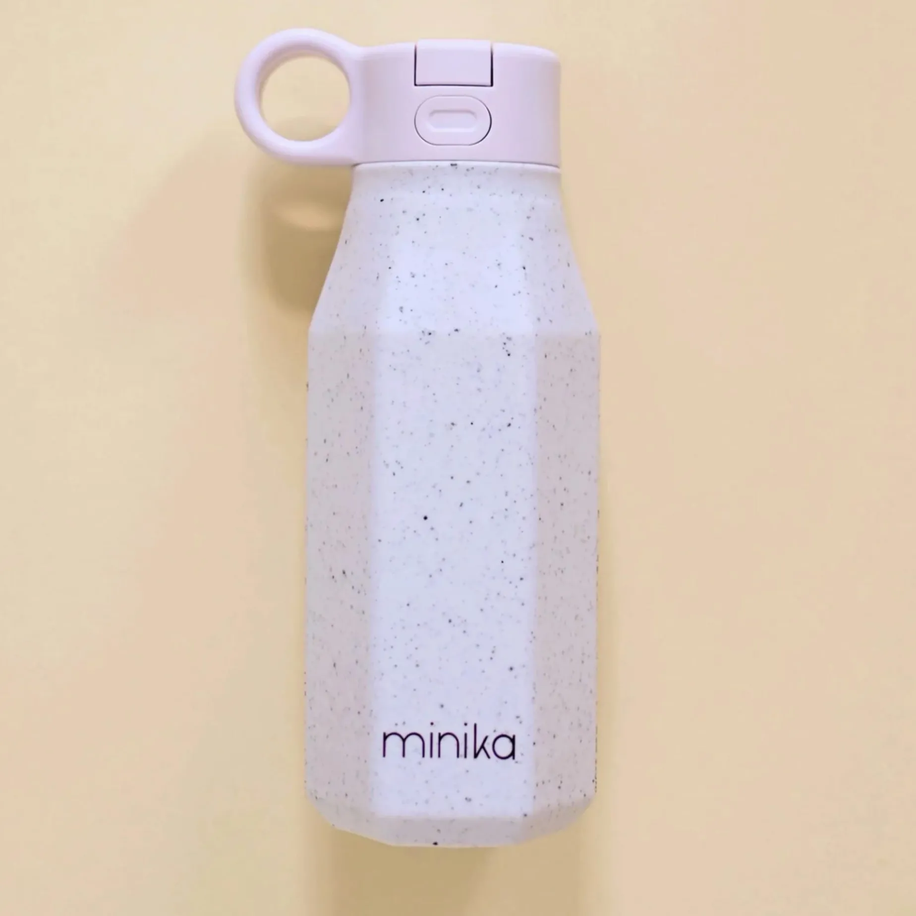 Silicone water bottle with straw and plastic lid. BPA-free food grade silicone. Wash with soap and a damp cloth or in the dishwasher. Ideal for transporting dinner in the lunch box.
