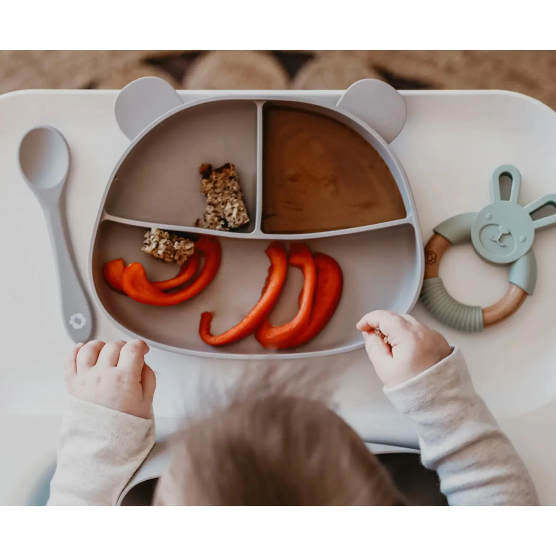 Our silicone plate is convenient, easy to clean and its grip on the table is impressive! It is the ideal accessory to guide your little guzzler in developing his autonomy at mealtime!