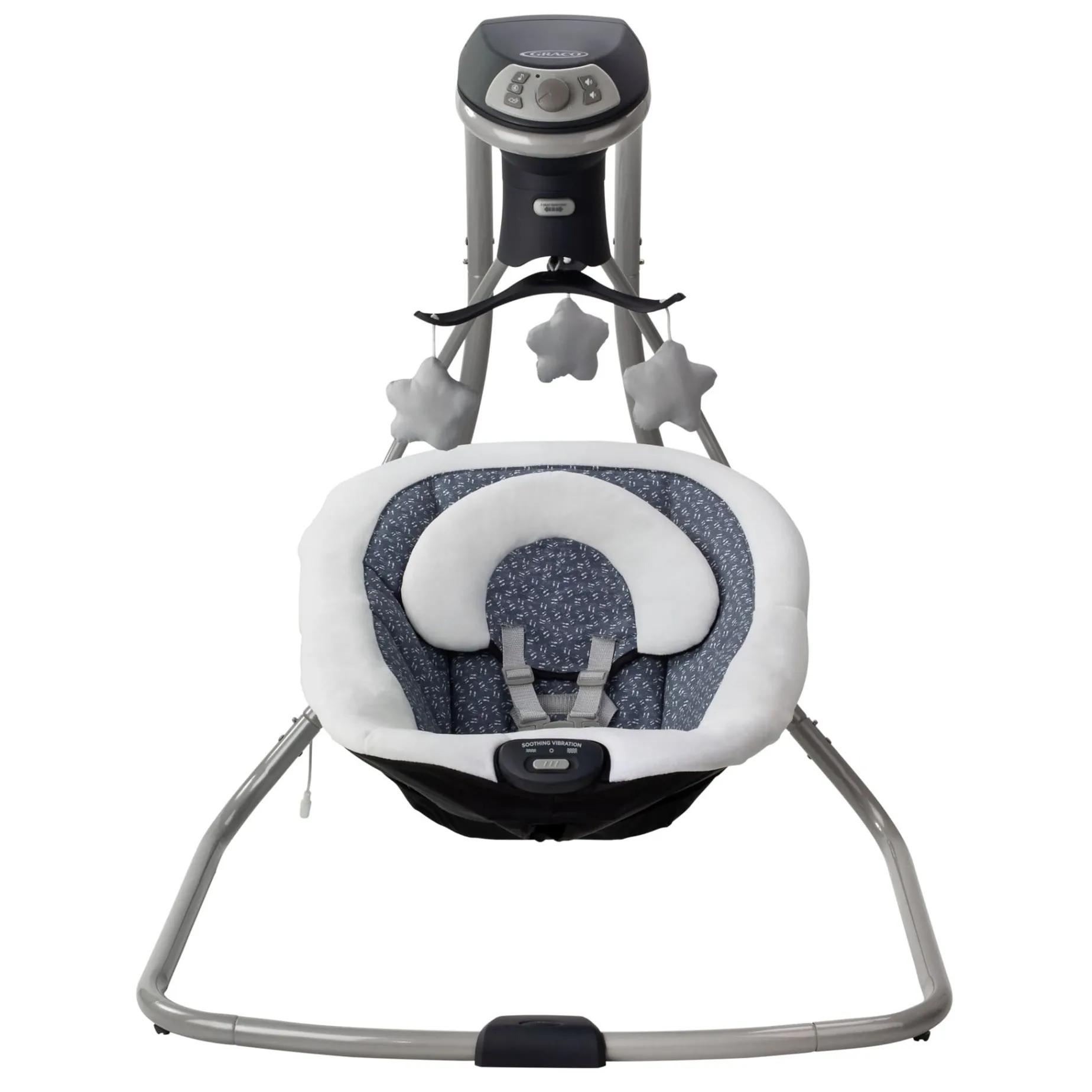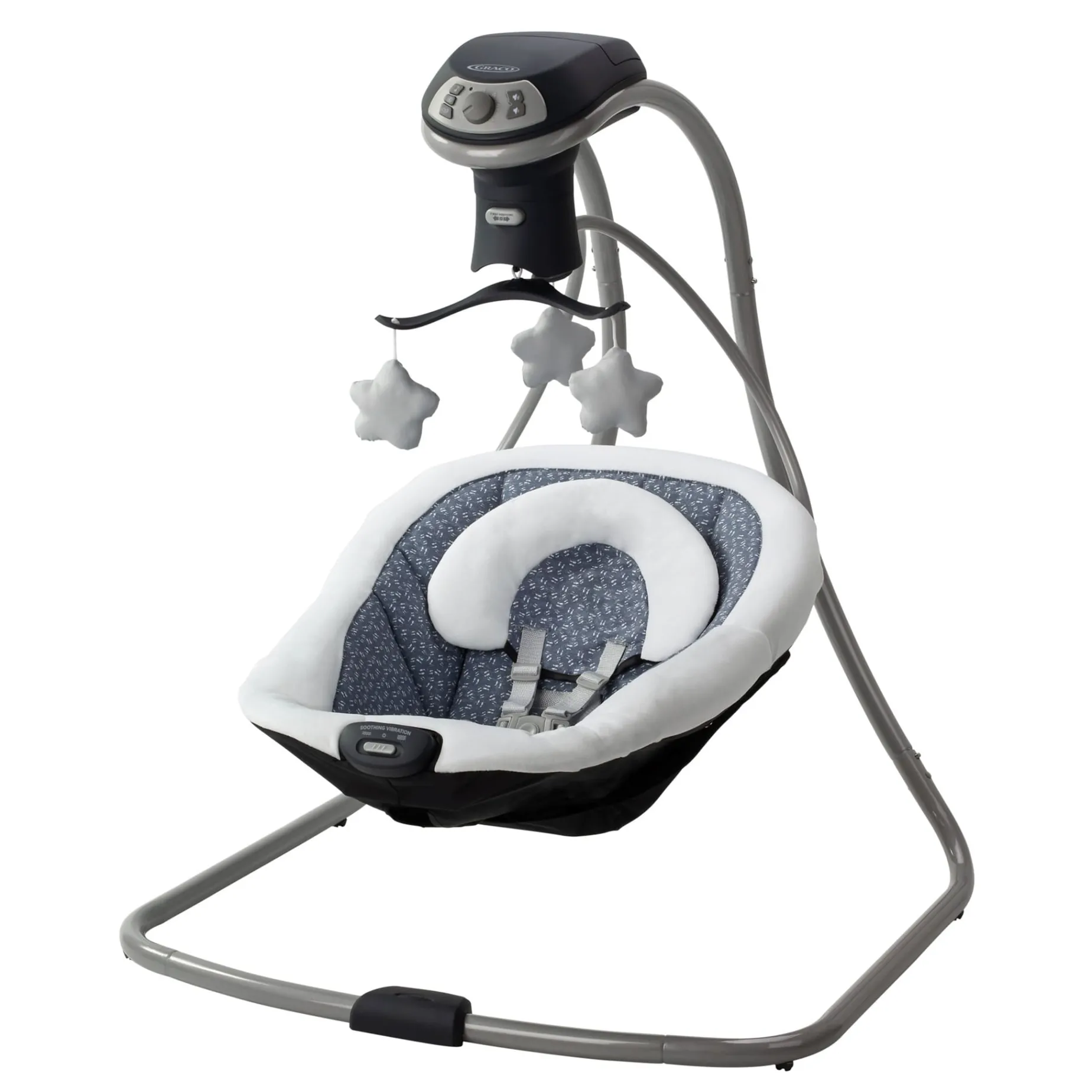 The Graco® Simple Sway™ LX Swing features a multi-direction seat that gives baby various viewpoints with options to face right, front or left. This seat design allows parents to change the motion from a side-to-side swing to a head-to-toe swing for longer soothing. The option to plug in or use batteries makes this swing ideal for any room in the home. This swing also features 6 swing speeds, 15 songs and sounds, a cozy head support and soothing 2-speed vibration to keep your little one content.